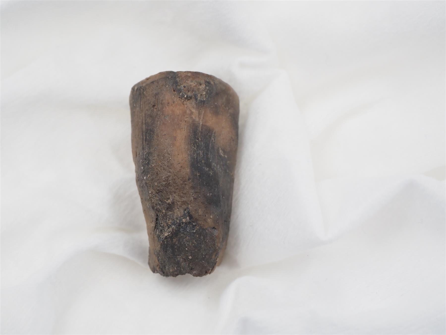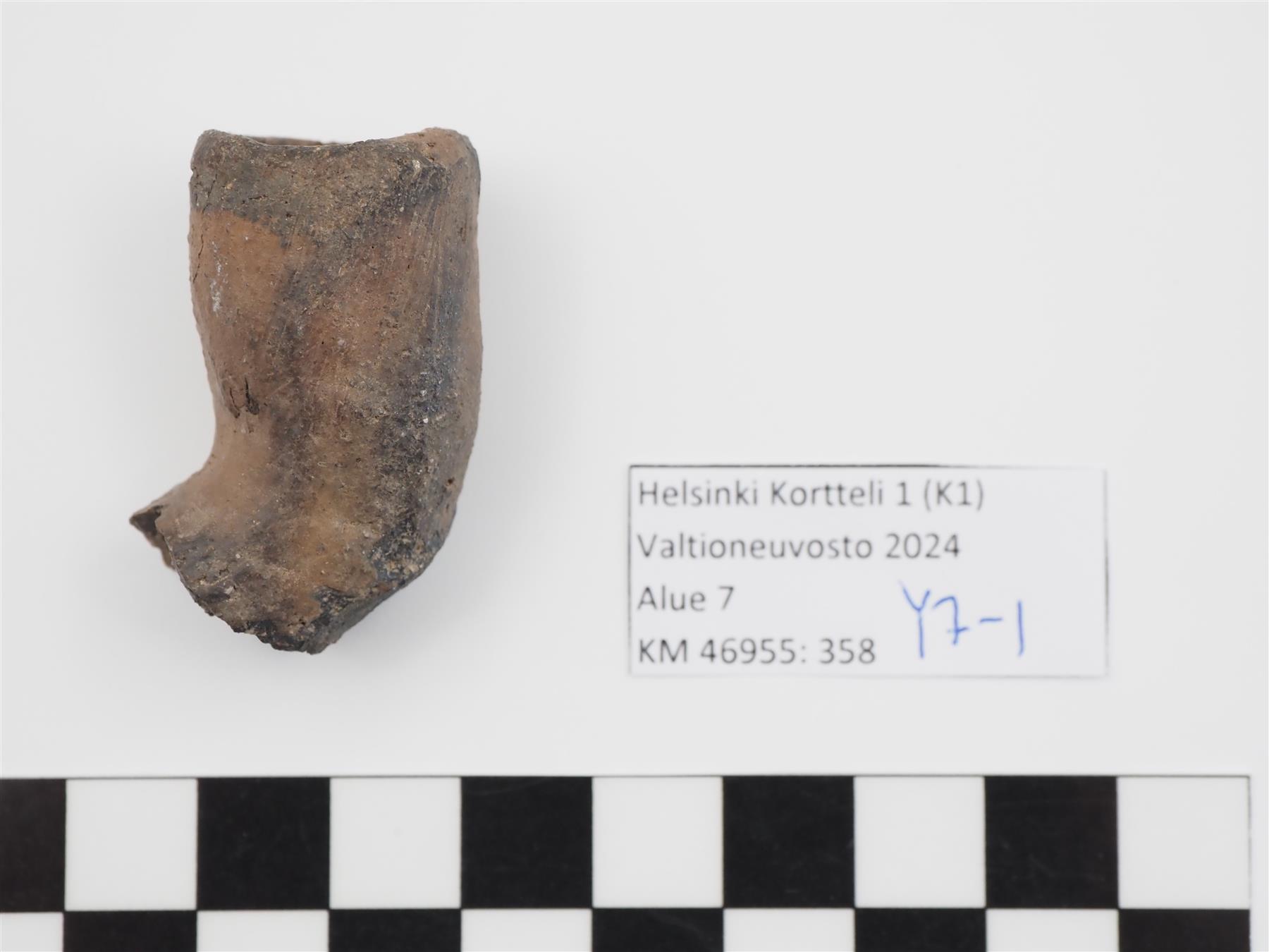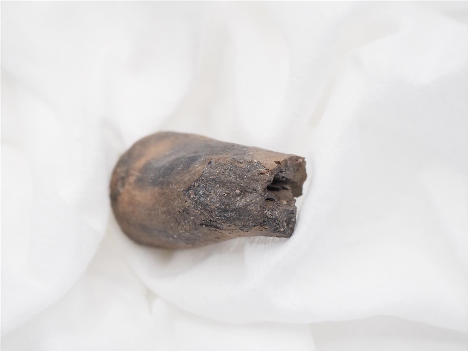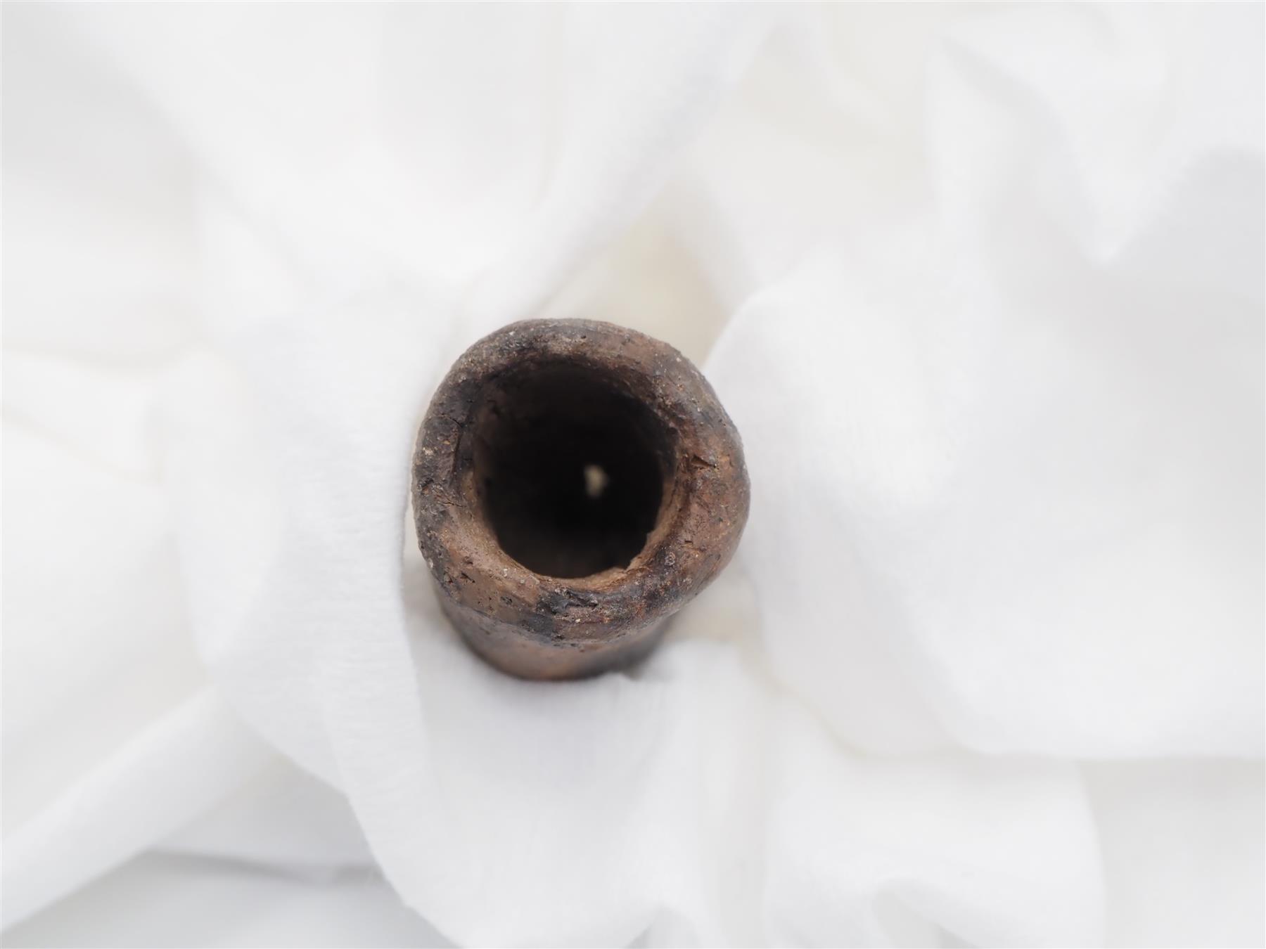 | Käsinmuotoillun punasavisen liitupiipun koppa. Pinta nokeentunut. | |