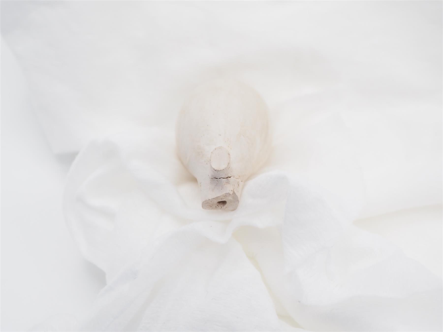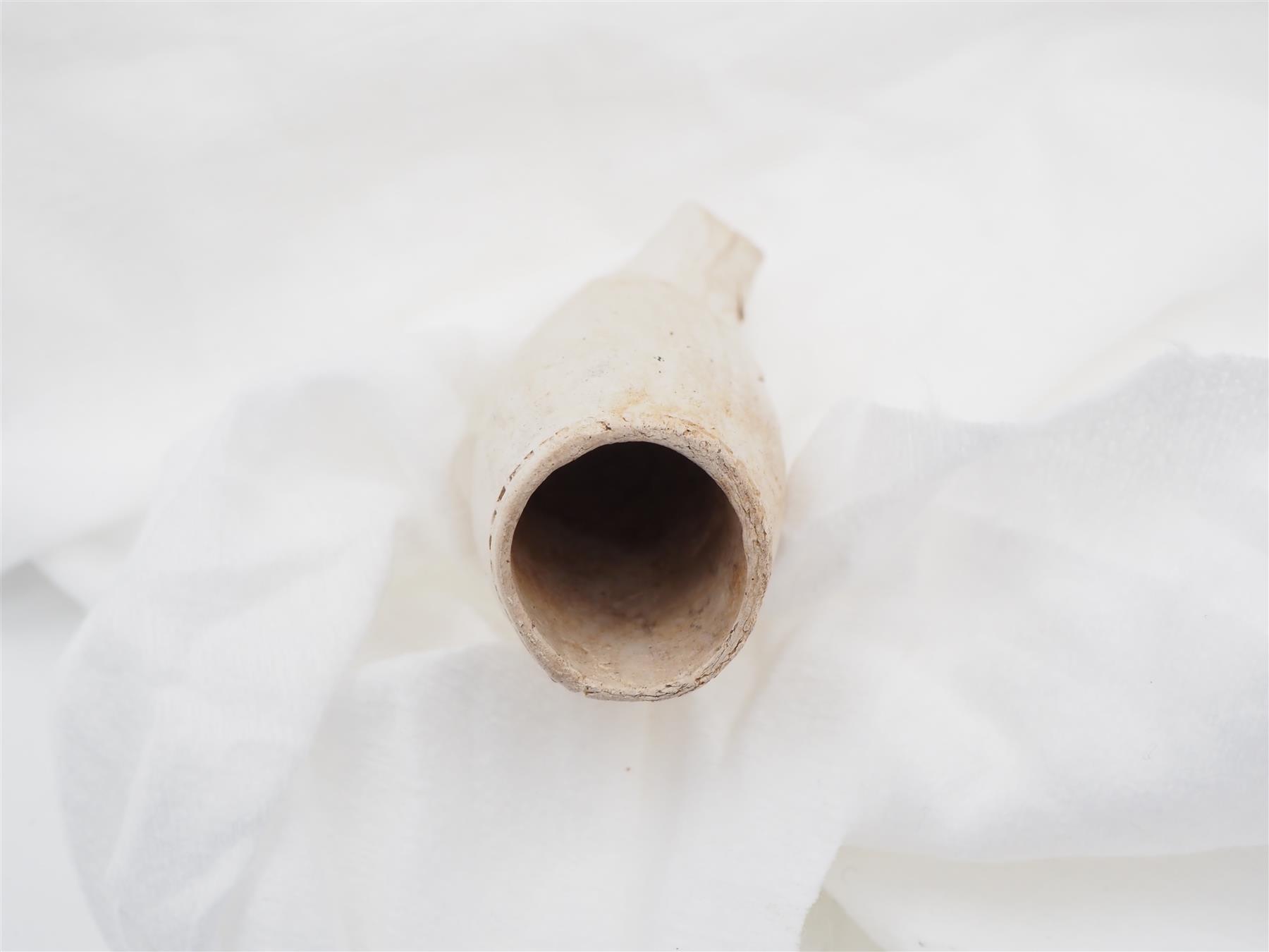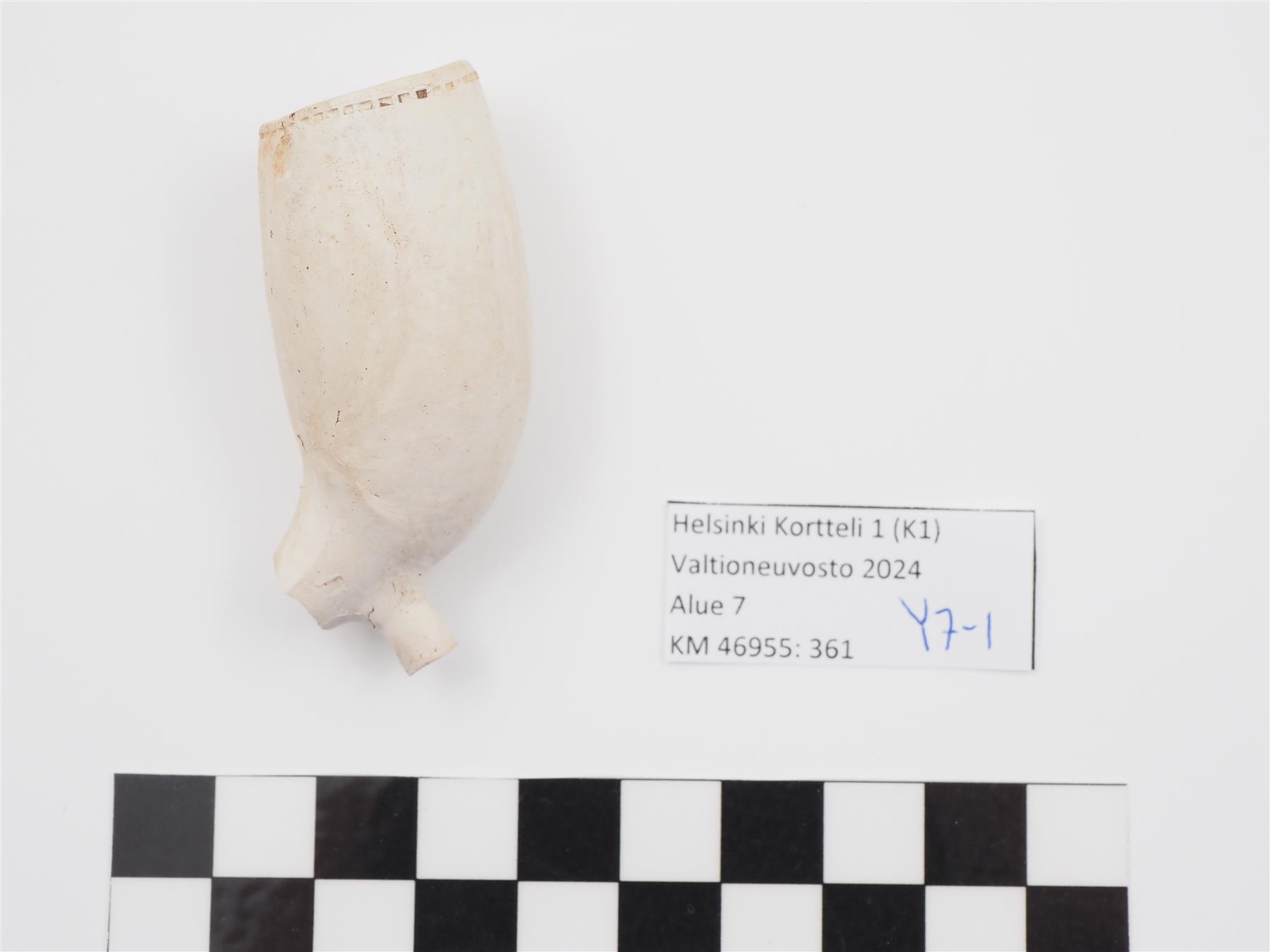 | Suurikokoinen liitupiipun koppa, vähän käytetty. Suureunassa kiertävää pisteviivakoristelua, muuten koristelematon. Hyvin ohut kanta.
