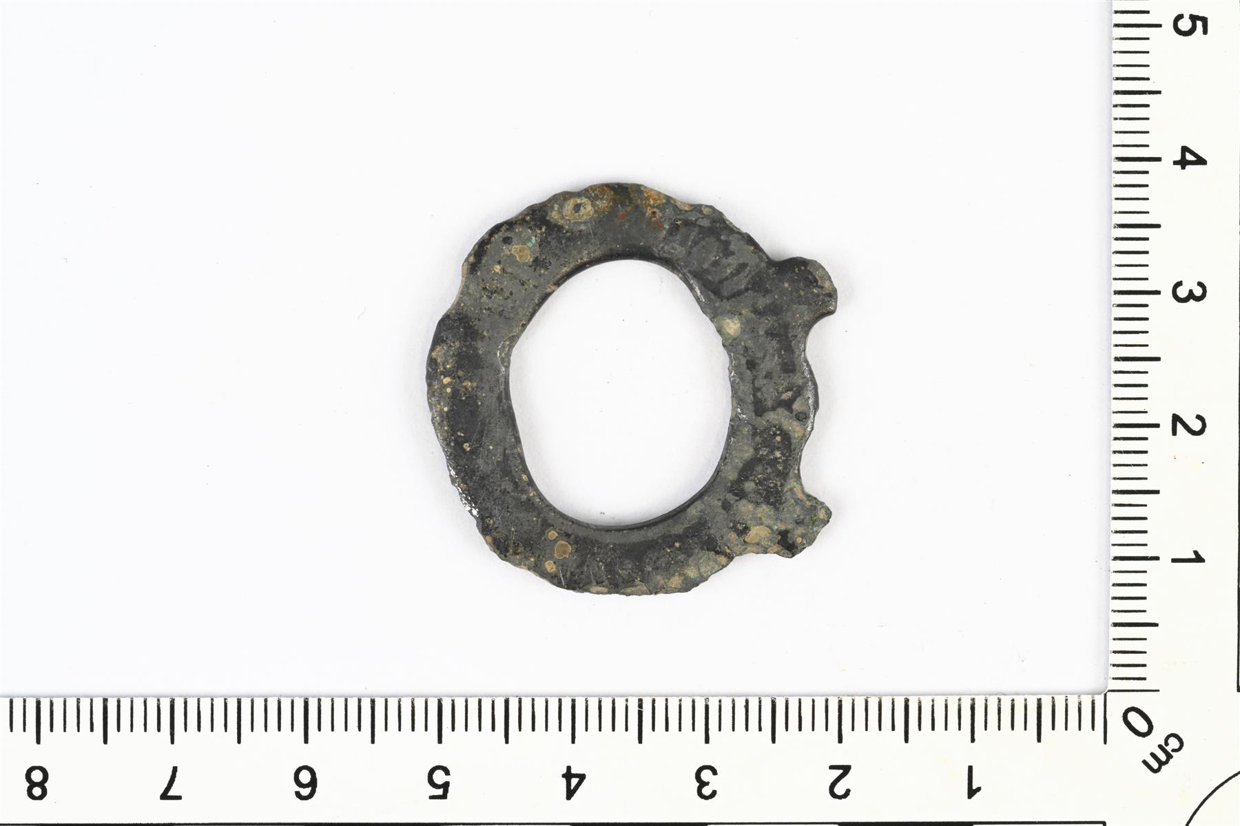 | Pyöreän vyön- tai hihnansoljen katkelma. Kehässä on kirjoitusta, mutta se on hyvin kulunut. | |
