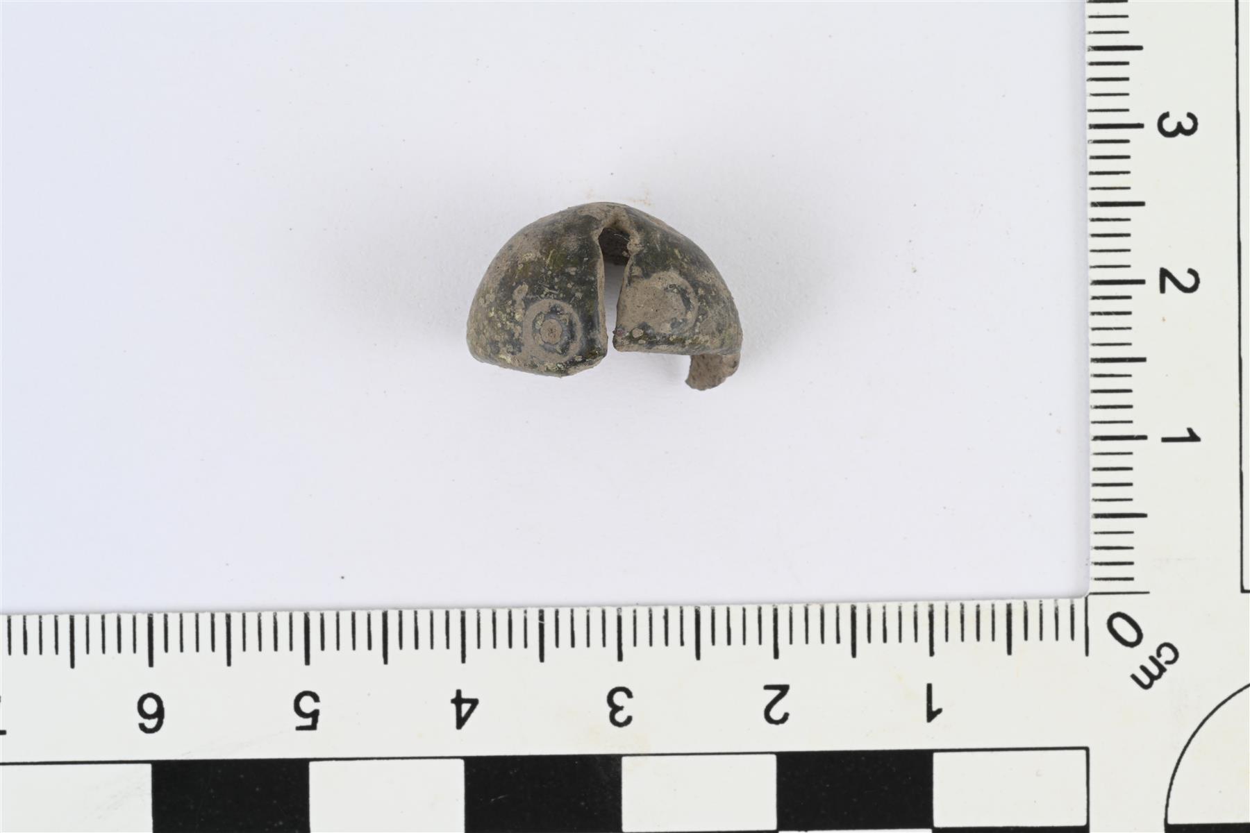 | Kulkusen katkelma, puolikas vaipan alaosasta, jossa kaksi lehdykkää ja niiden välissä oleva äänirako. Koristeluna häränsilmäleimoja. Vastaa Rainion ryhmää 1. | |