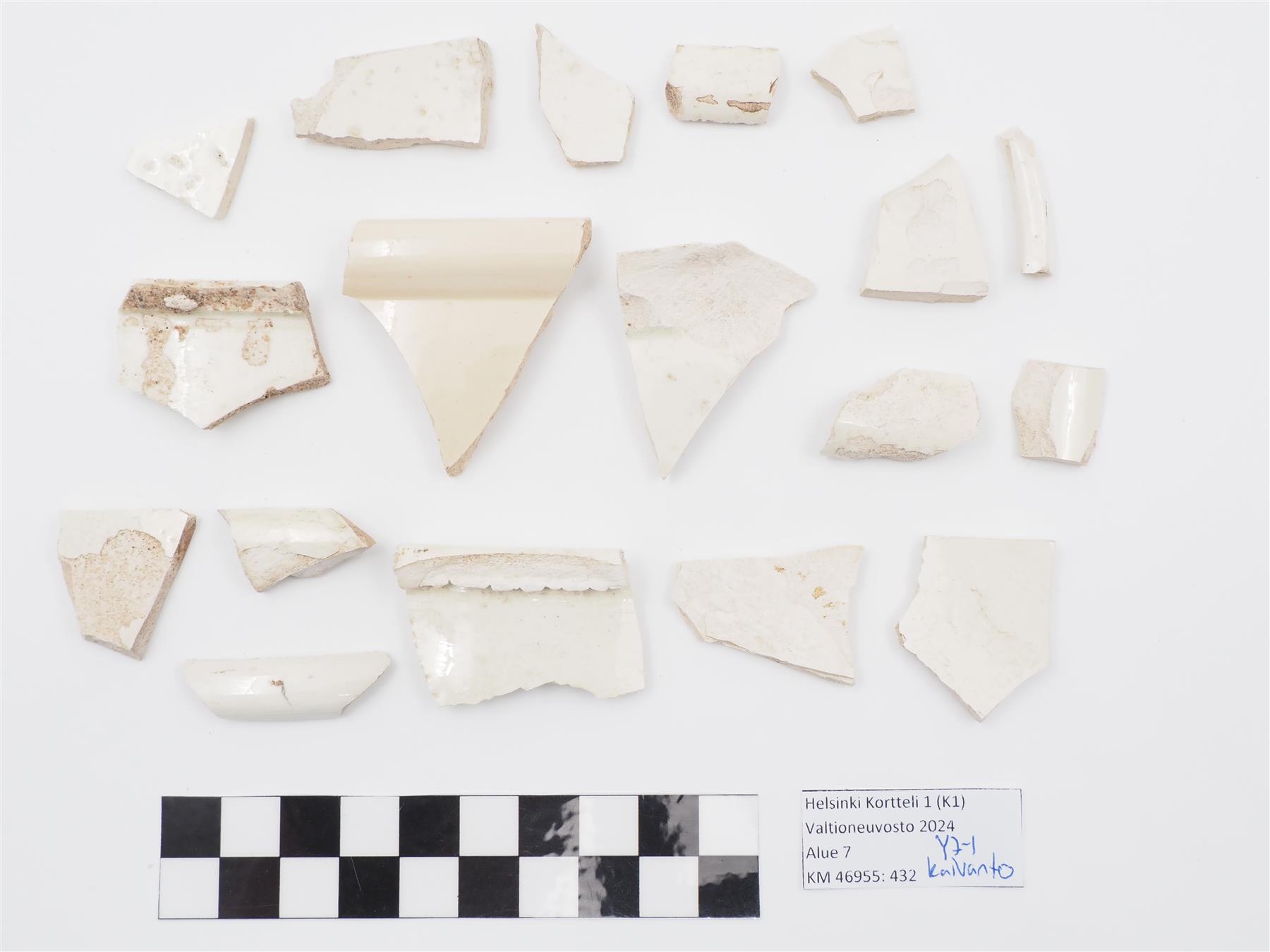 | 18 kpl piiposliiniastian paloja. Molemmilla pinnoilla valkoinen tinalasite, ei koristelua. | |