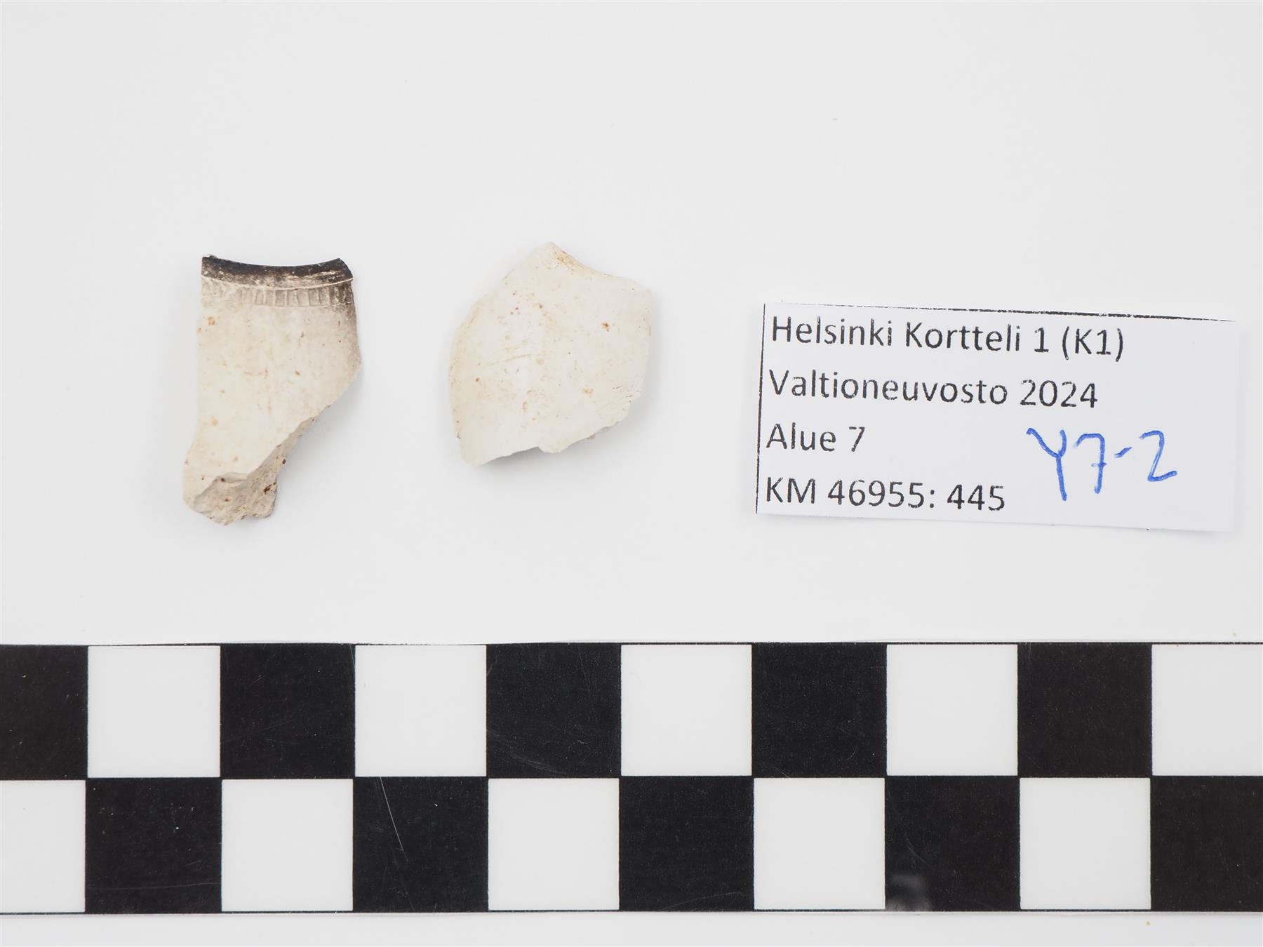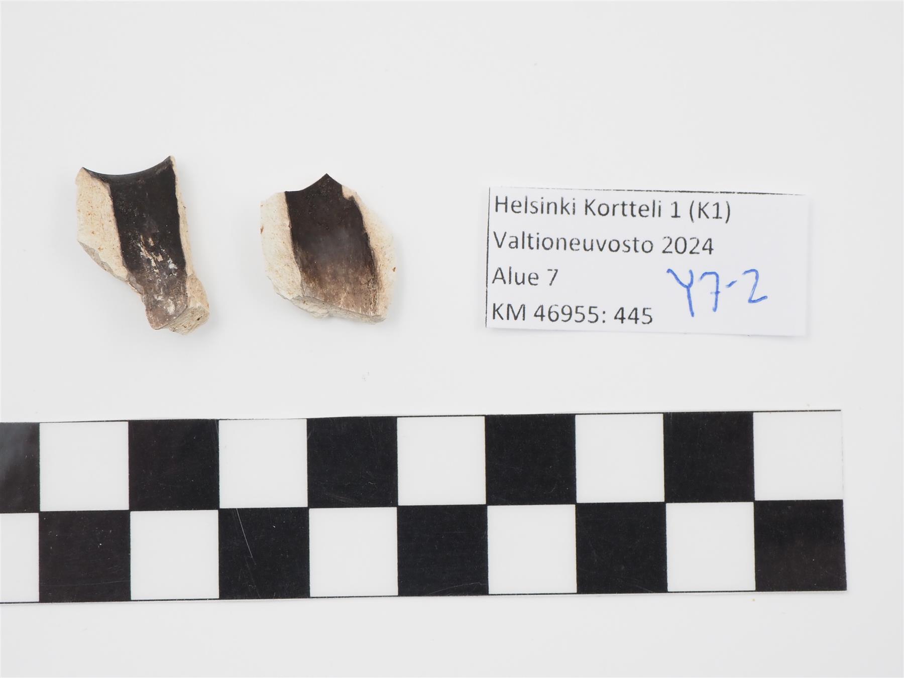 | 2 kpl liitupiipun pesän kappaleita. sisäpinta nokeentunut mustaksi, käytetty paljon. Toinen kappaleista suureuna, jossa nähtävissä reunaa kiertävää pisteviivakoristelua. | |