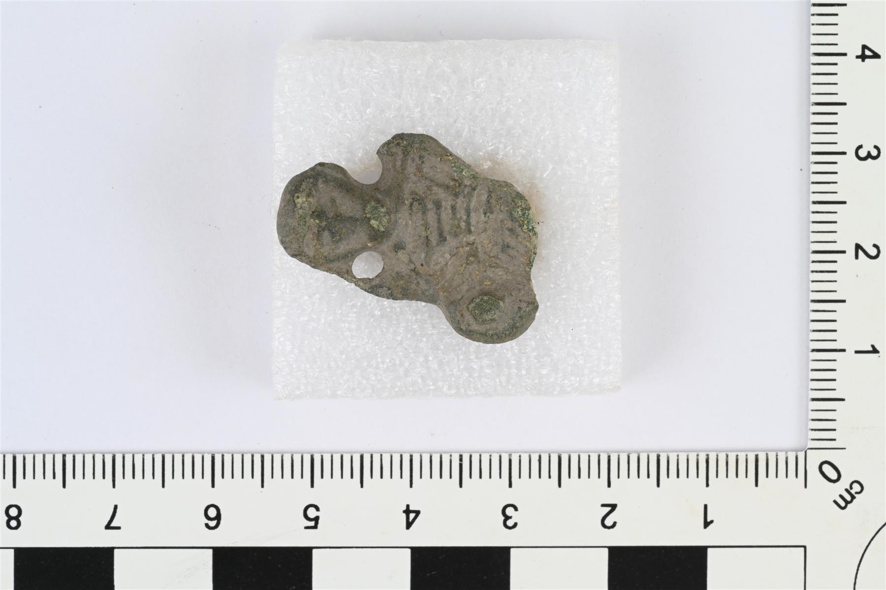 | Skandinaavisen tasavartisen soljen päätykatkelma. Vastaa Kivikosken tyyppiä 2. Aivan soljen päässä reliefinä ihmiskasvot, niiden molemmin puolin pyöreät reiät, muussa osassa pintaa viivakoristelua. | |