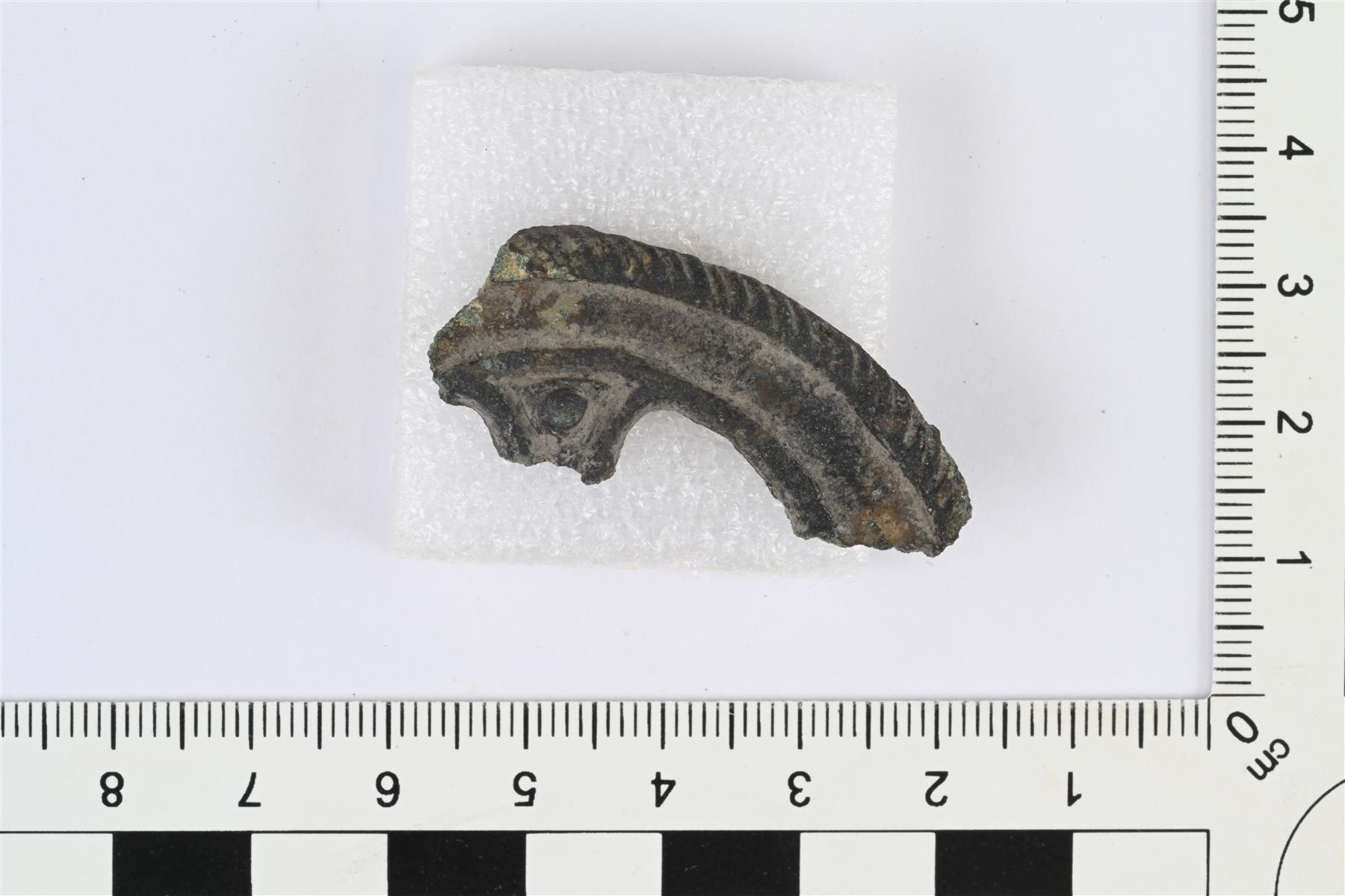| Pyöreän puhkonaisen soljen reunakatkelma. Leveä reunus, jonka uloin reuna nyörikoristeinen. Reunuksen sisällä ollut ilmeisesti tasavartinen ristikuvio, josta jäljellä yksi ristivarsi, varren päässä matala tappi. Taustapuolella neulan kiinnityslenkki. | |