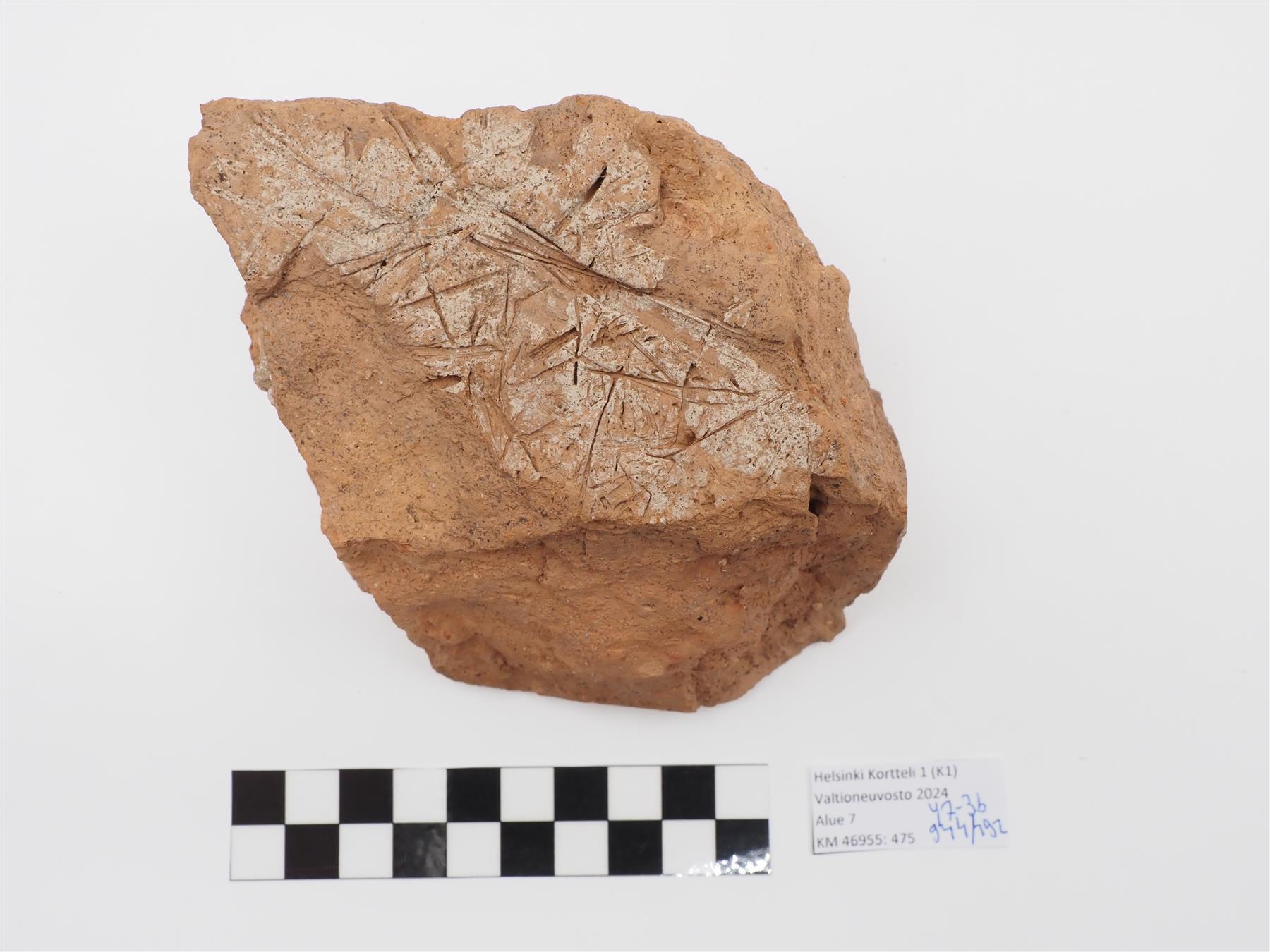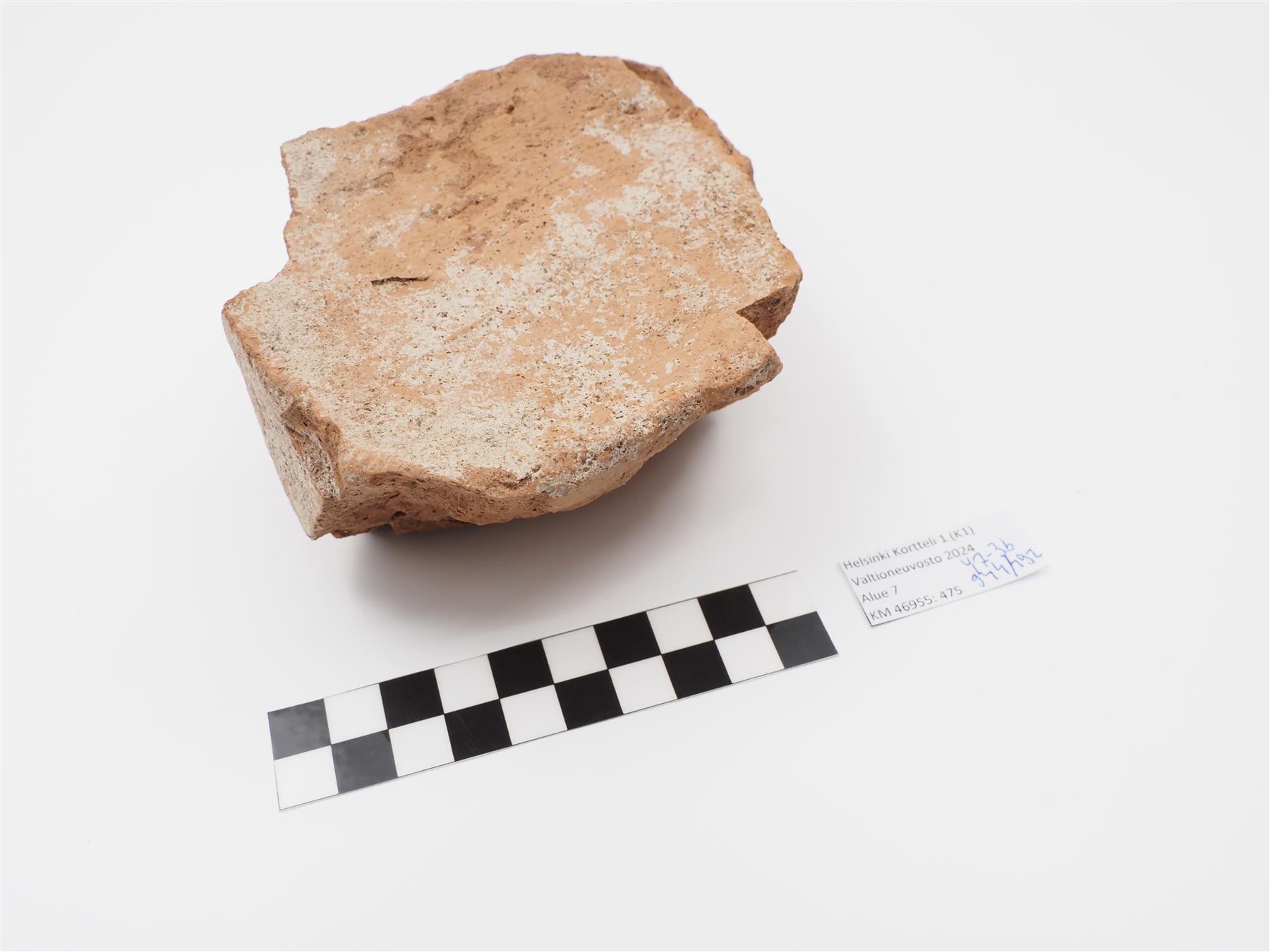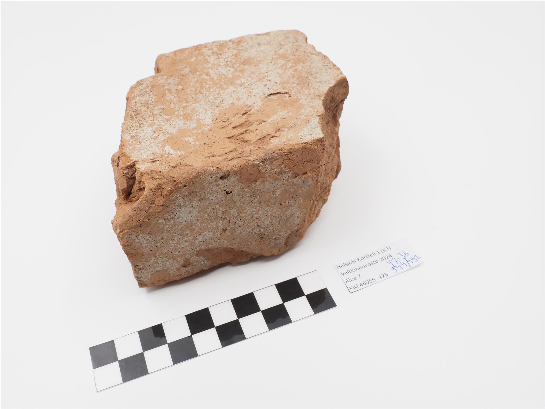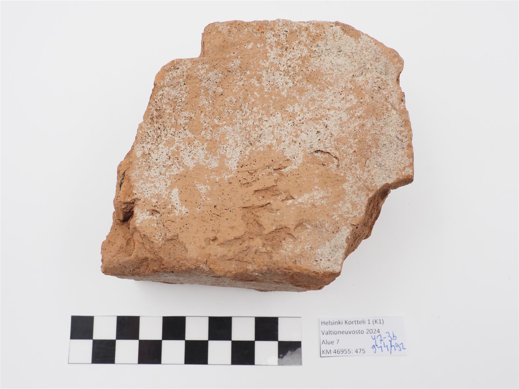 | Punasavisen tiilen kappale. Käsin muotoitu, toisella puolella kuivumisen aika tulleita painanteita. Massa vaaleanpunaista, eriväristä kuin :474. Pinnalla jälkiä laastista. | |