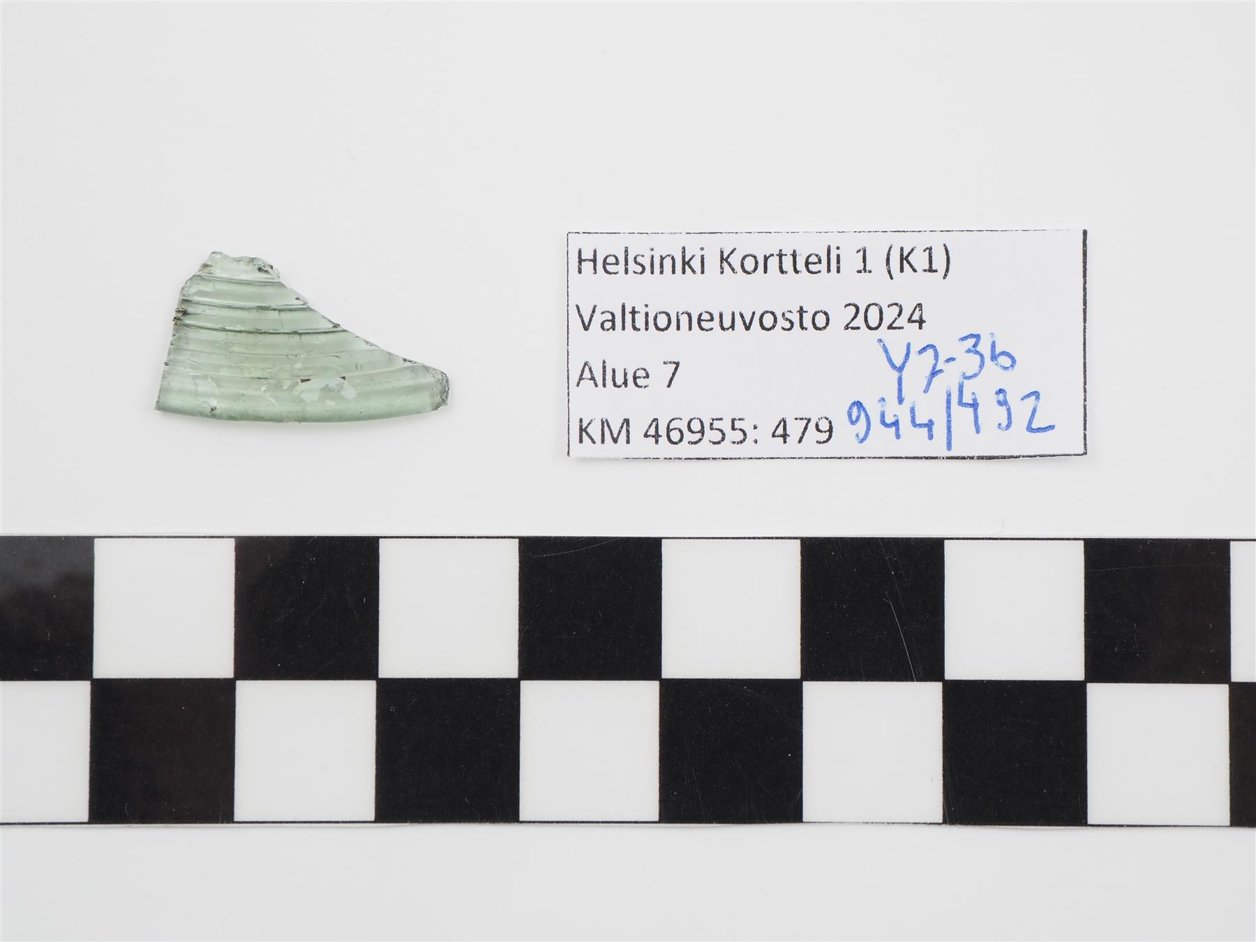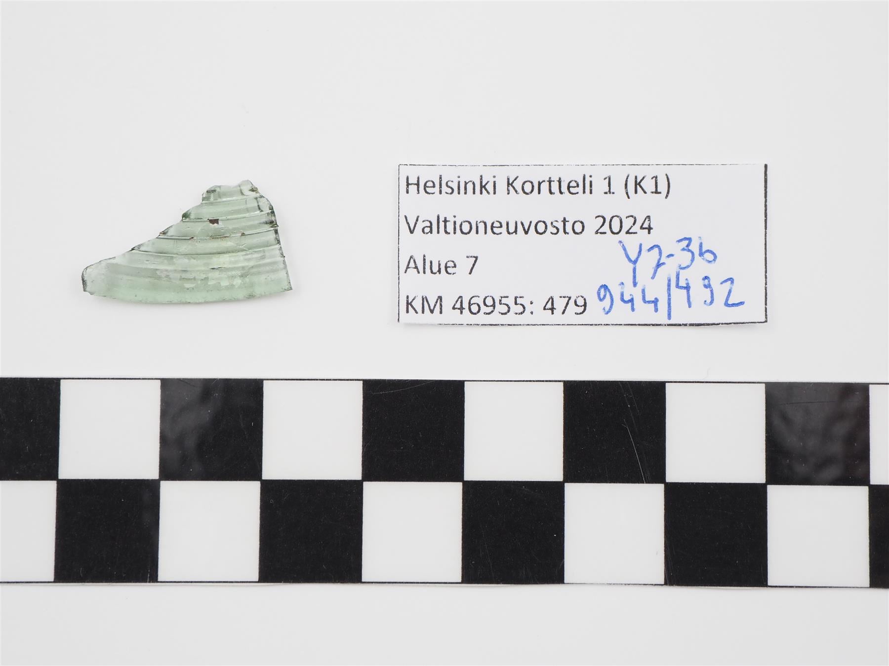 | Vihreän juomalasin tai pikarin jalkalevyn kappale, pinta rihlattu. | |