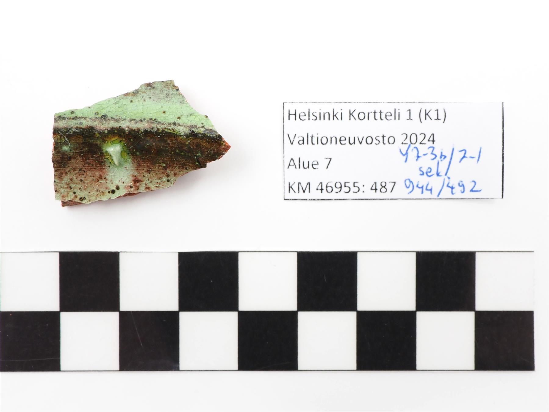 | Punasaviastian kylkipala. Sisäpinnalla kirkas vihreä lyijylasite, jossa tummanvihreitä läiskiä. Ulkopinta puoliksi lasittamaton ja tummunut, alareunassa nähtävillä hieman vihreää lasitetta. | |