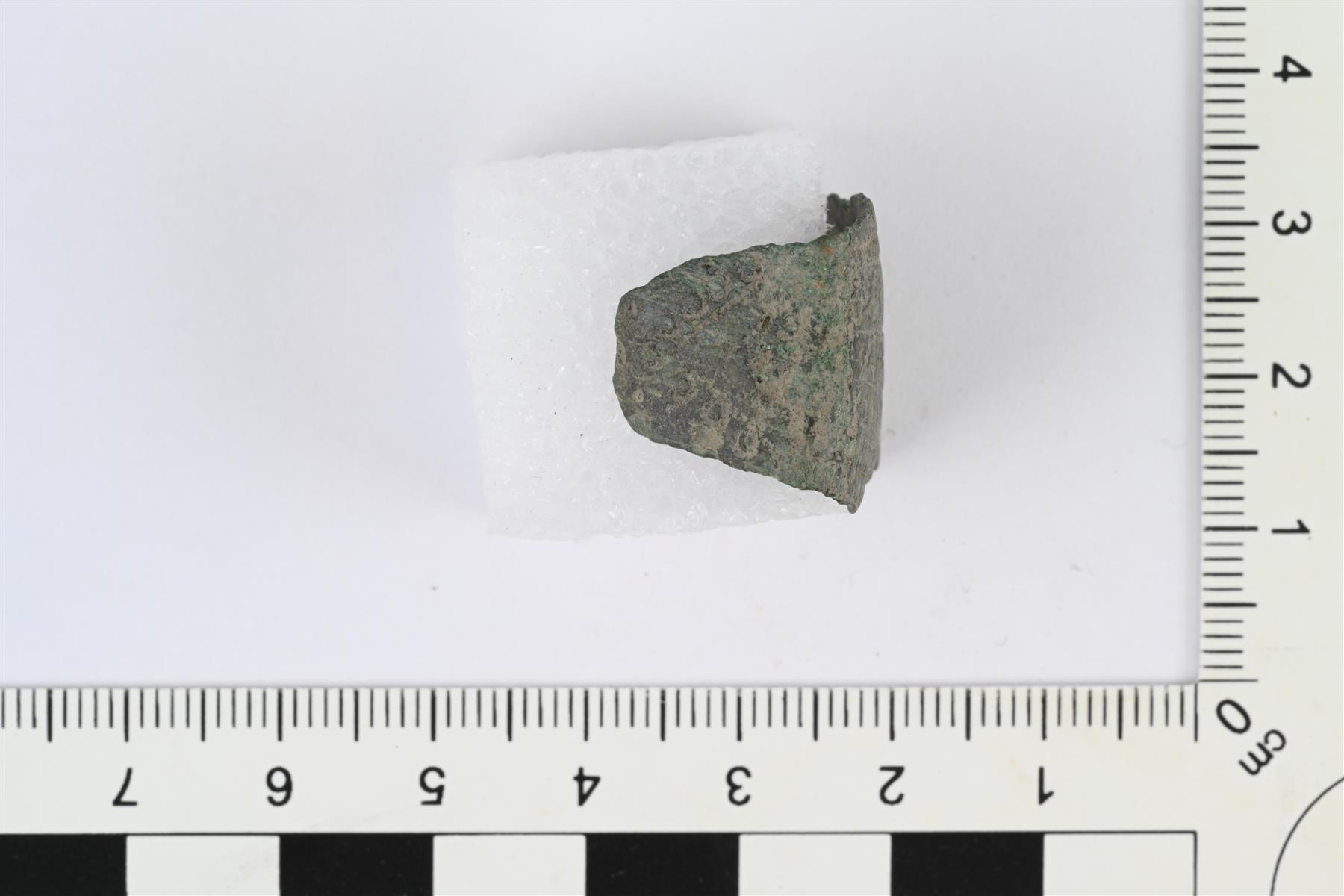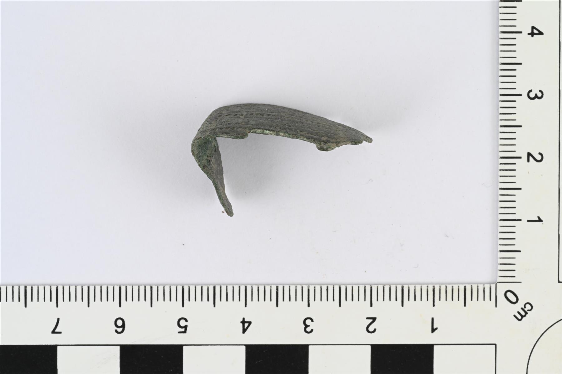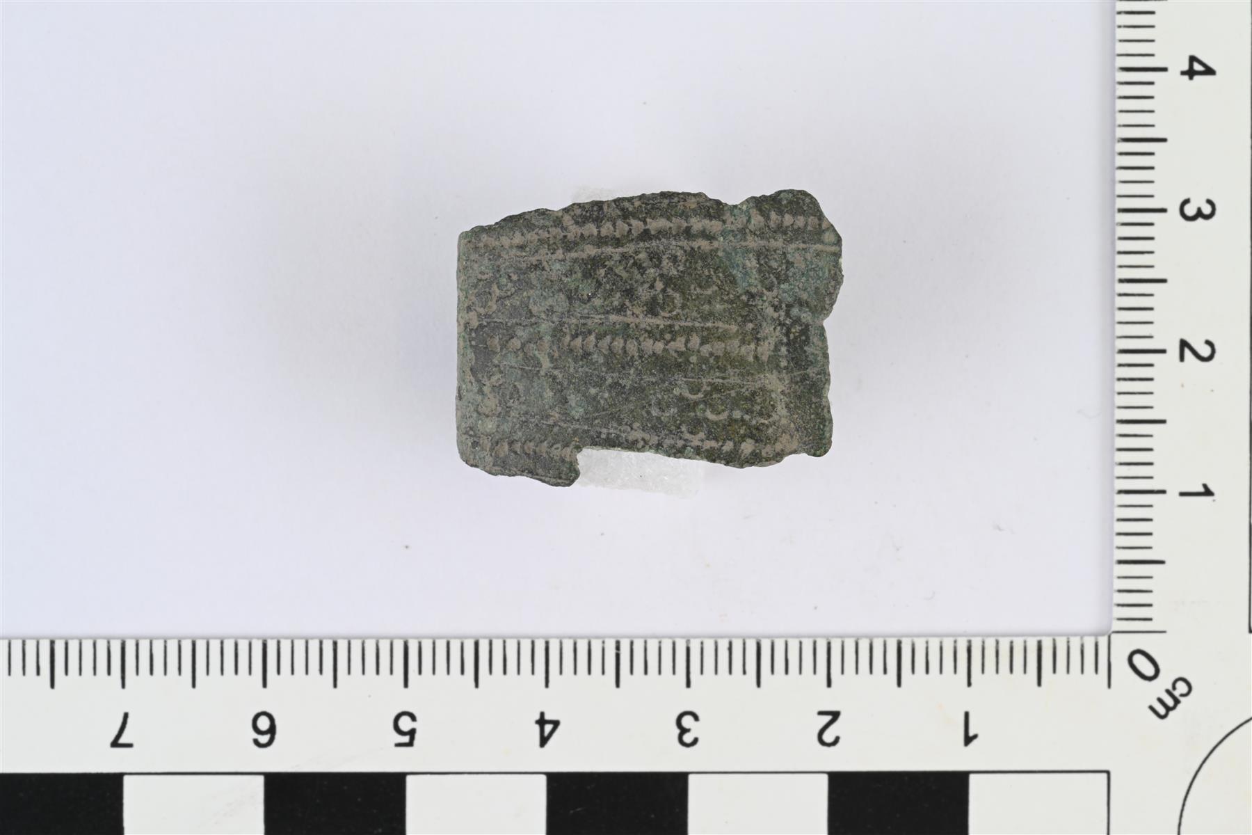 | Levymäisen rannerenkaan päätykatkelma. Lähes kaksin kerroin taittunut. Etupuolella viiva-, piste- ja ympyräkoristelua. | |