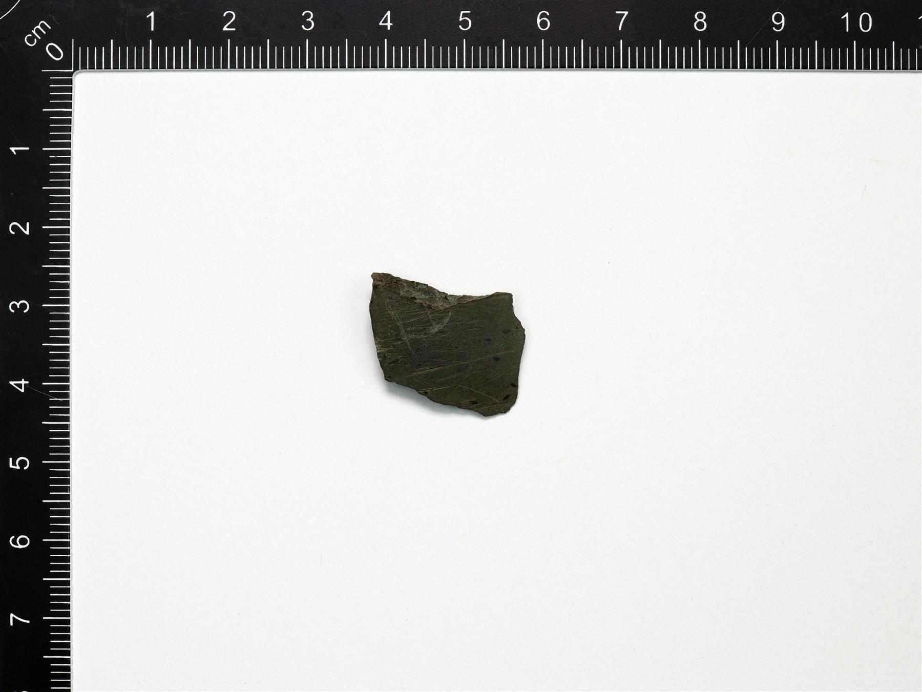 | Hiotun kivitaltan katkelma. Tummanharmaata liusketta. | |