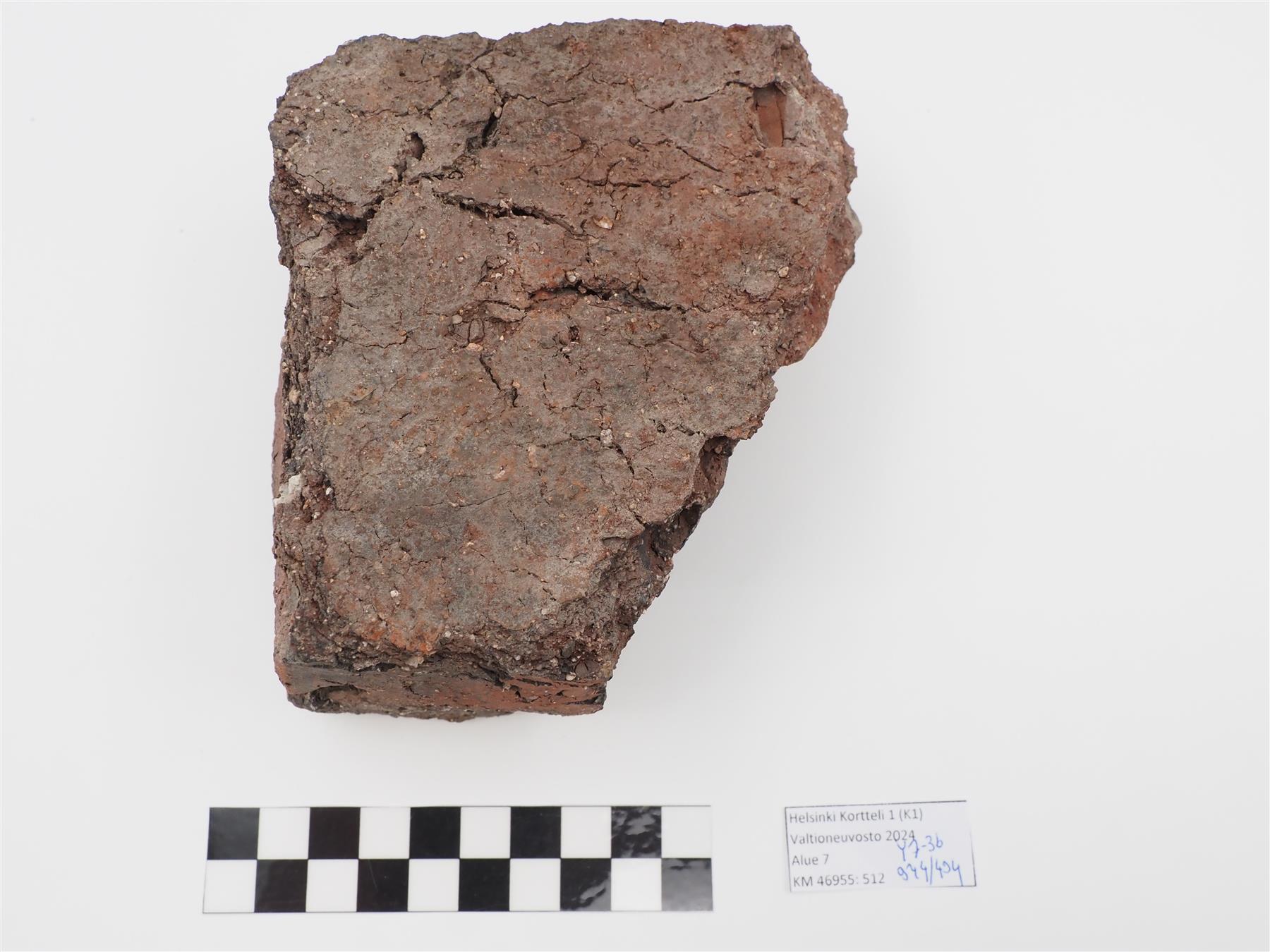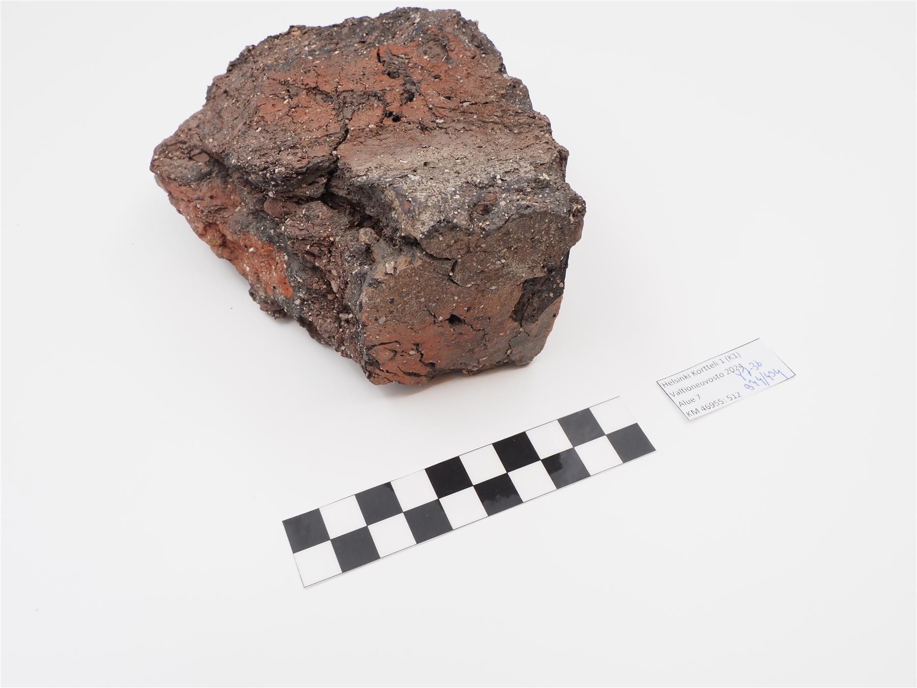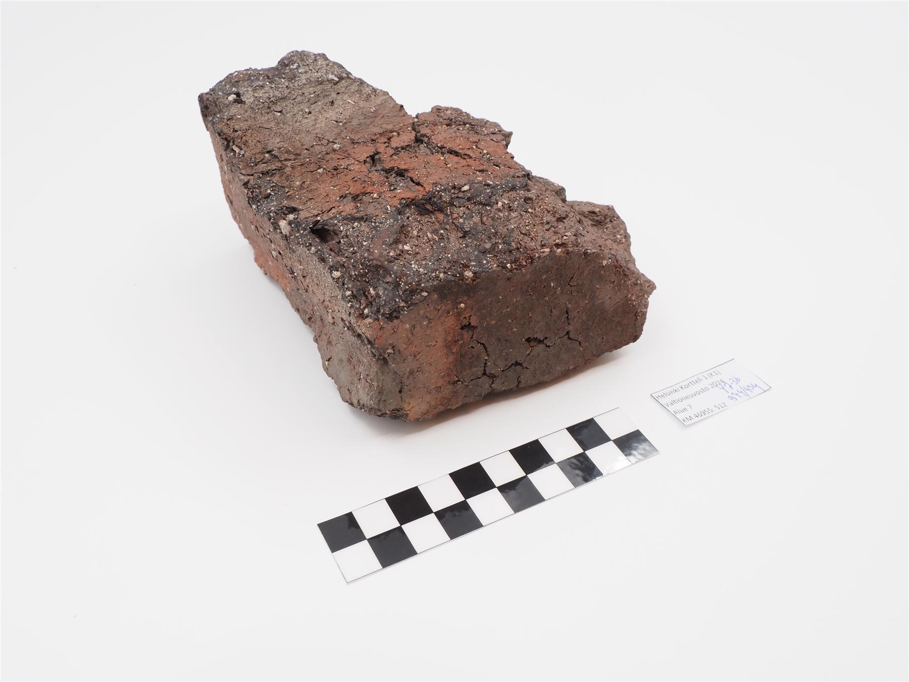 | Punasavisen tiilen kappale. Tummanpunainen saviaines, sekoite valkoista. Pinnat palaneet osittain mustaksi. | |