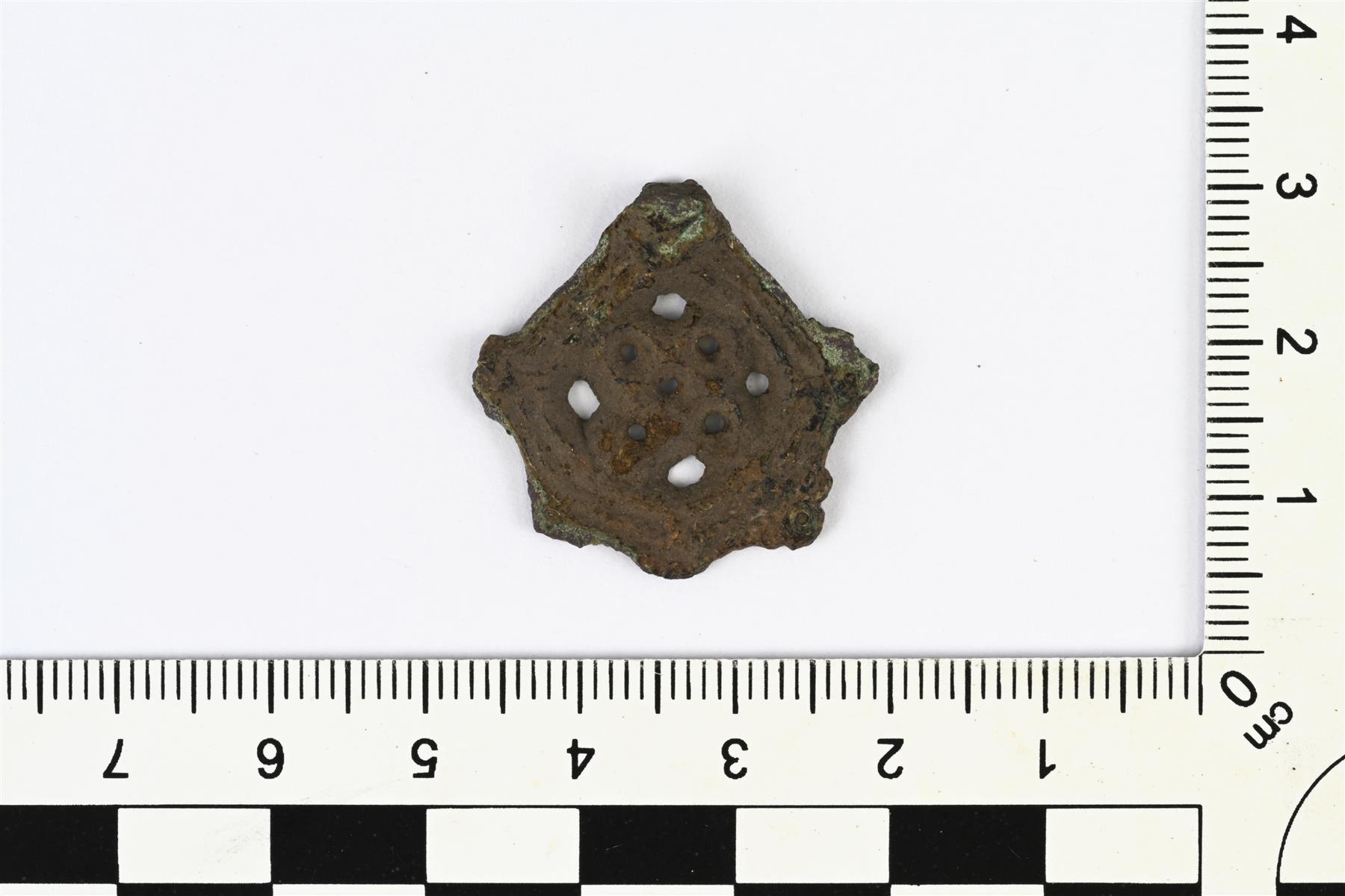 | Pyöreä osmansolmuriipus. Koristeluna viivauurteita ja reikiä. Ripustuslenkki on hajonnut. Vrt. Kivikoski Abb. 777. | |