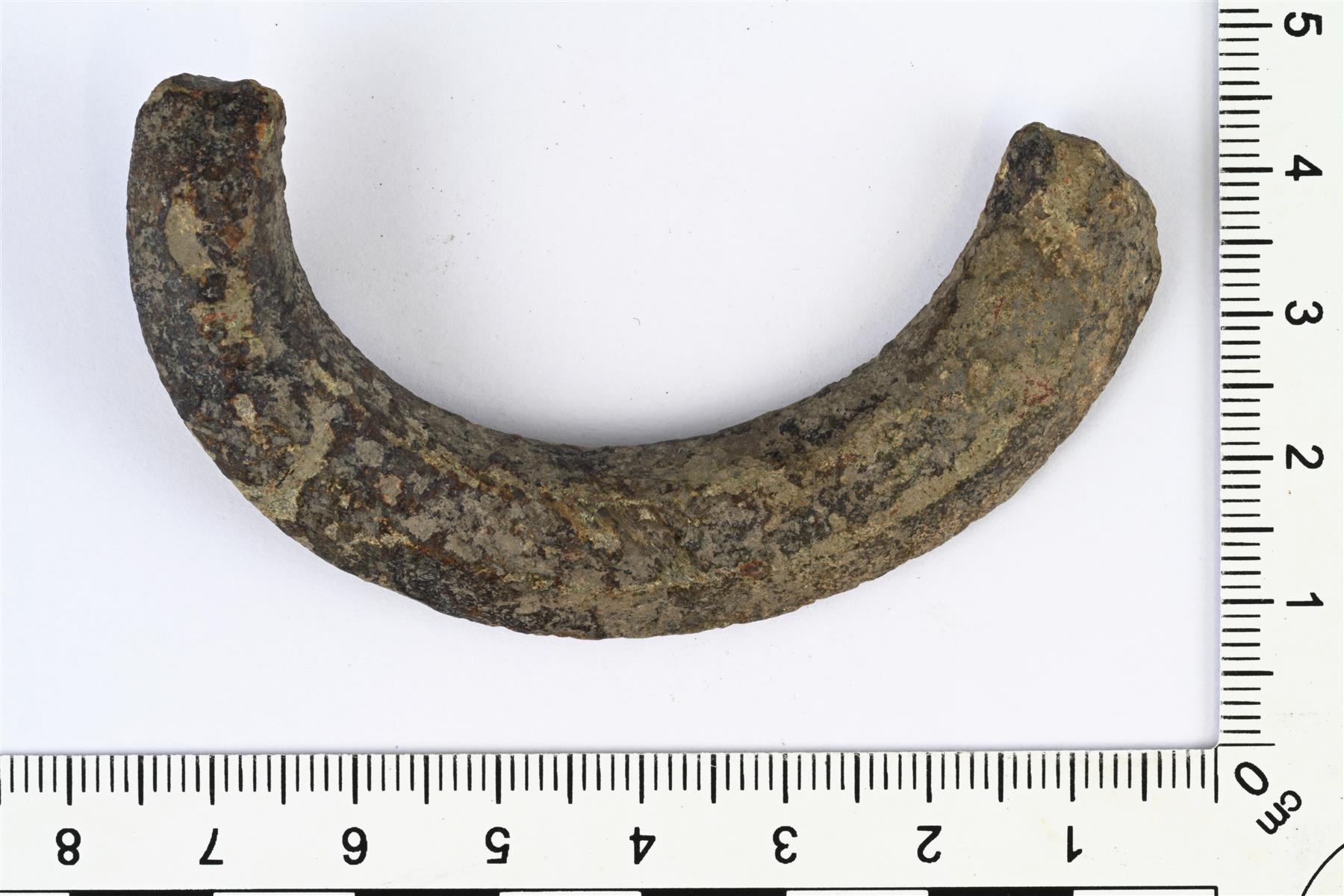 | Hevosenkenkäsoljen kehän katkelma. Toisella puolella on lenkki neulan kiinnitystä varten. | |