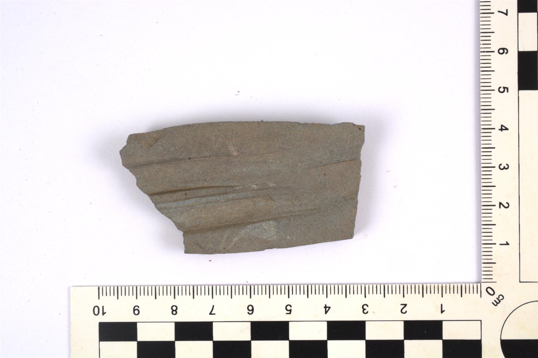 | Harmaan hiomakiven katkelma. Kummallakin puolella ja yhdellä kapealla sivulla on kapeita kulumisjälkiä hiomisesta (Taltan terän hiominen?). | |