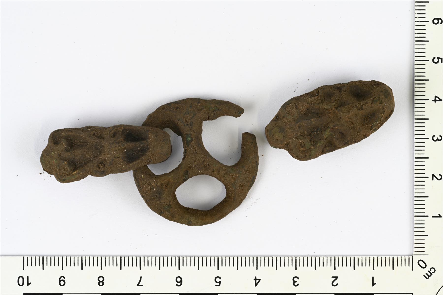 | Hihnanjakajan rengas ja kaksi eläinpäistä helaa. Rengas on kolmipuolainen ja osa kehästä on hajonnut. Helat ovat koristeltu yksinkertaisella reliefikuvioinnilla. | |