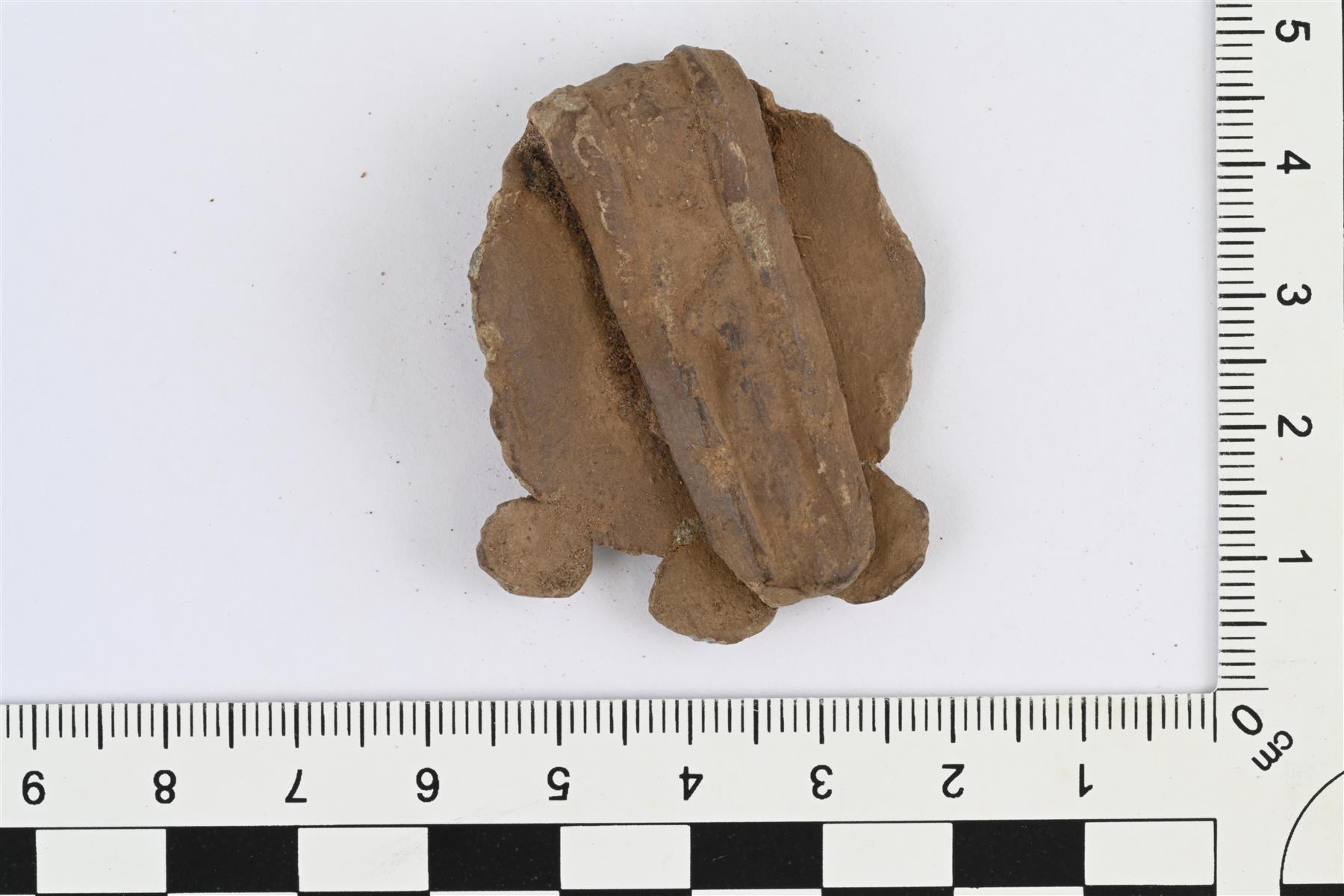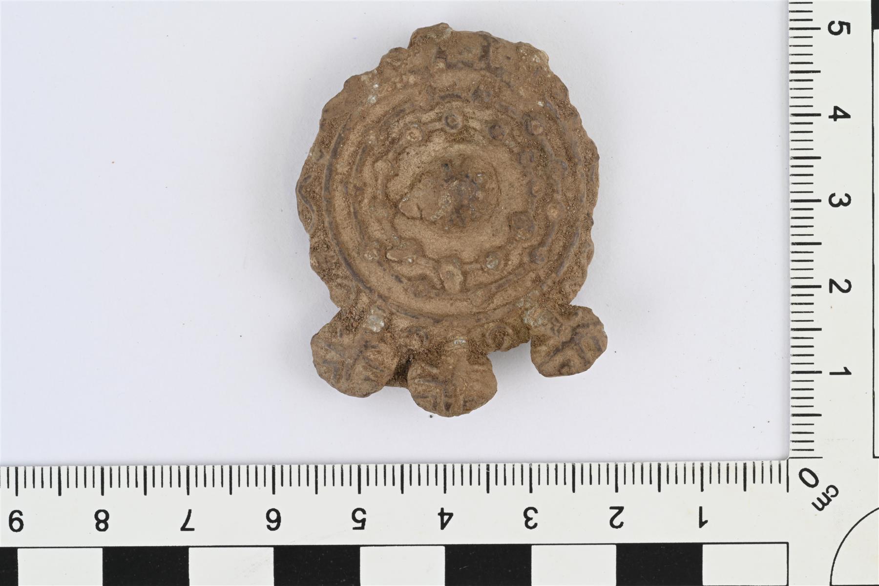 | Suuri hela tms. Luultavasti lyijyä, tinaa tai niiden seosta. Pyöreä, yhdessä reunassa kolme pyöreää uloketta, vastakkaisessa reunassa taustapuolelle taittuva litteä varsi. Etupuolella reliefikoristelua, jossa sisäkkäisiä kehiä ja niissä kohopisteitä, pyöreissä ulokkeissa ristikuviot. | |