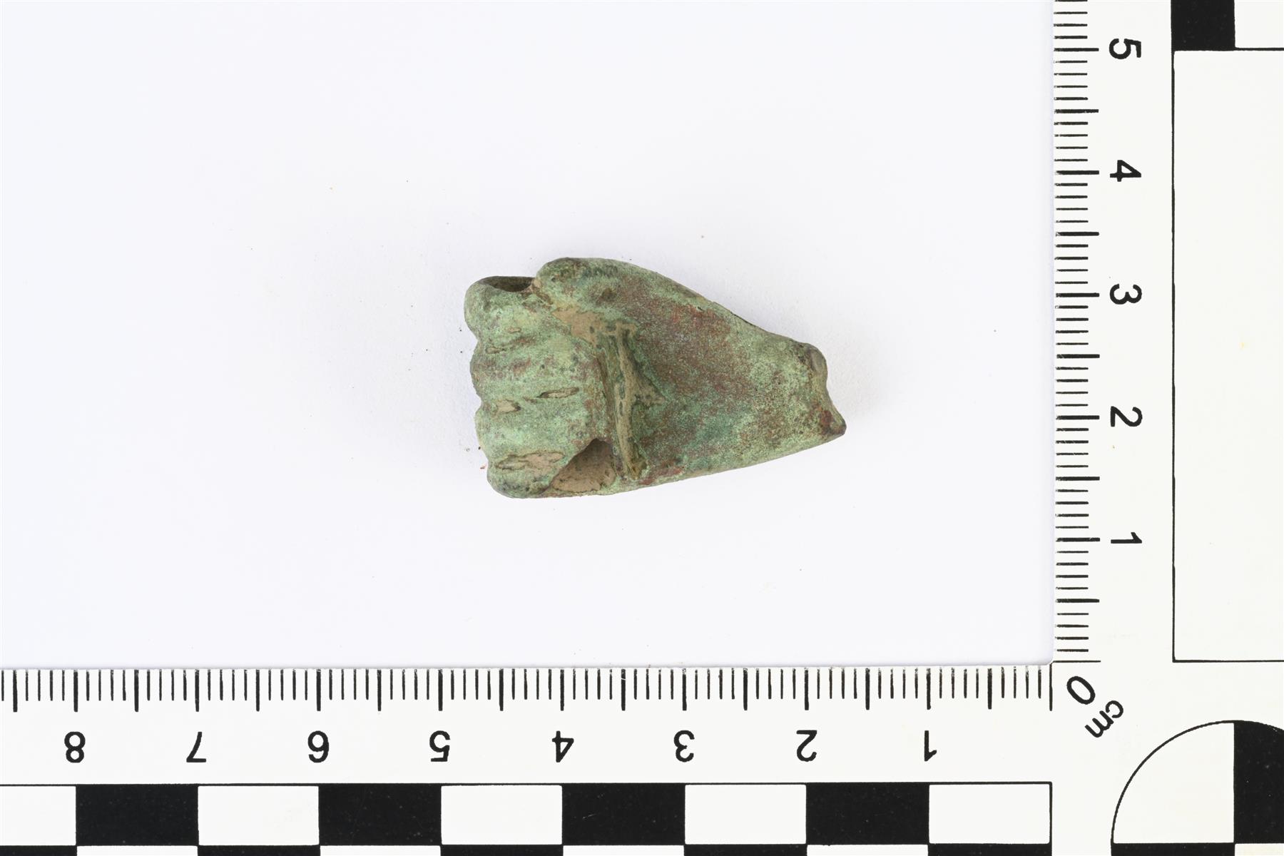 | Kupariseoksinen nyrkki, jonka läpi menee reikä. Todennäköisimmin pienen veistoksen katkelma. | |