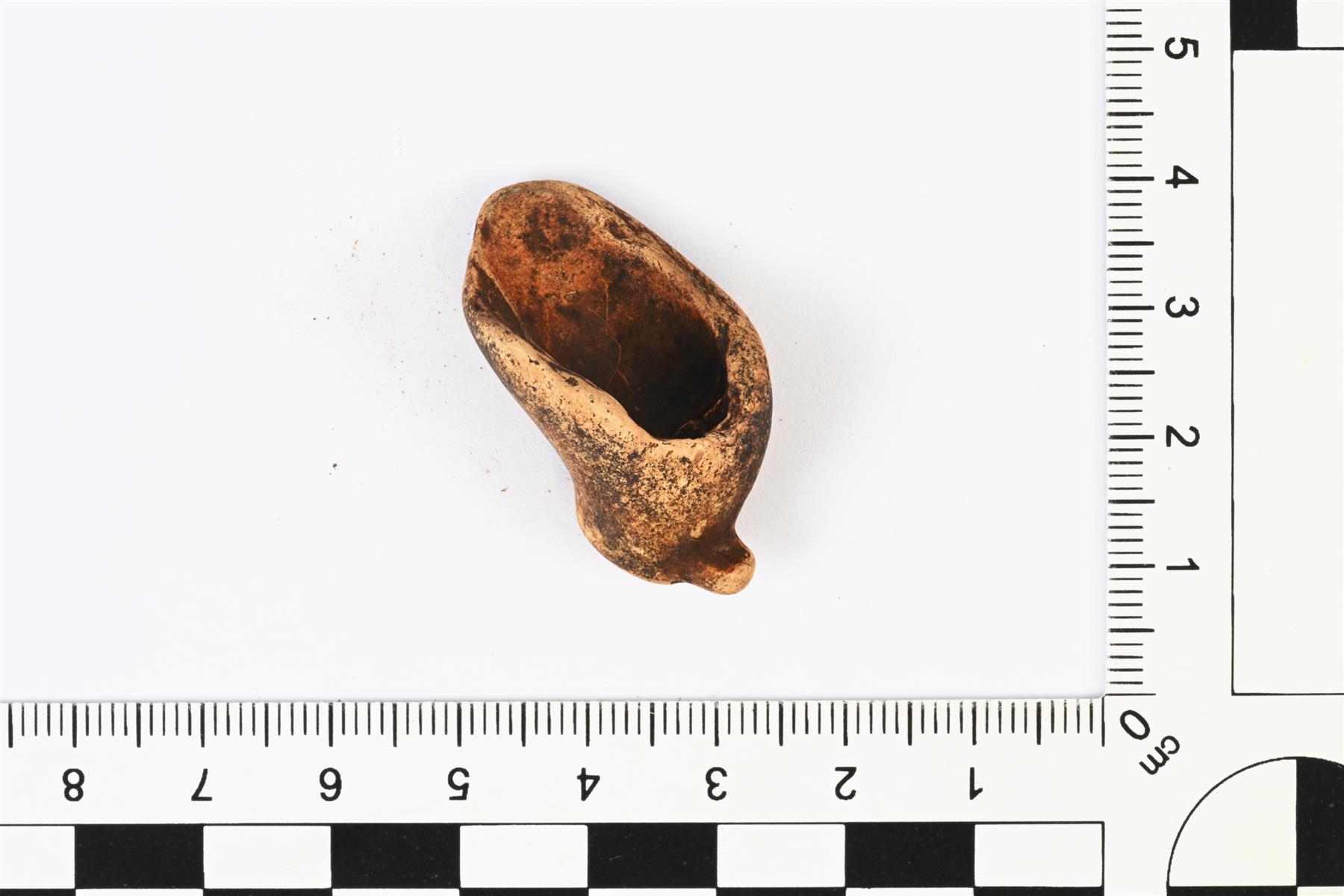 | Koristelematon liitupiipun koppa. Alaosassa on pieni kanta. Värjäytynyt punertavanruskeaksi. | |