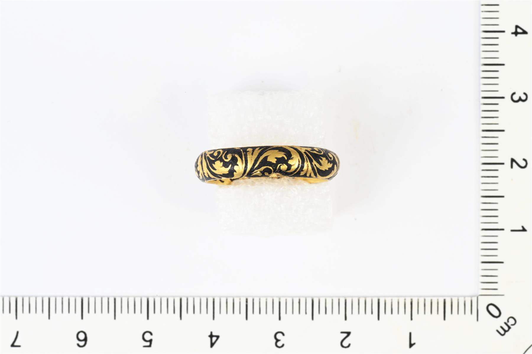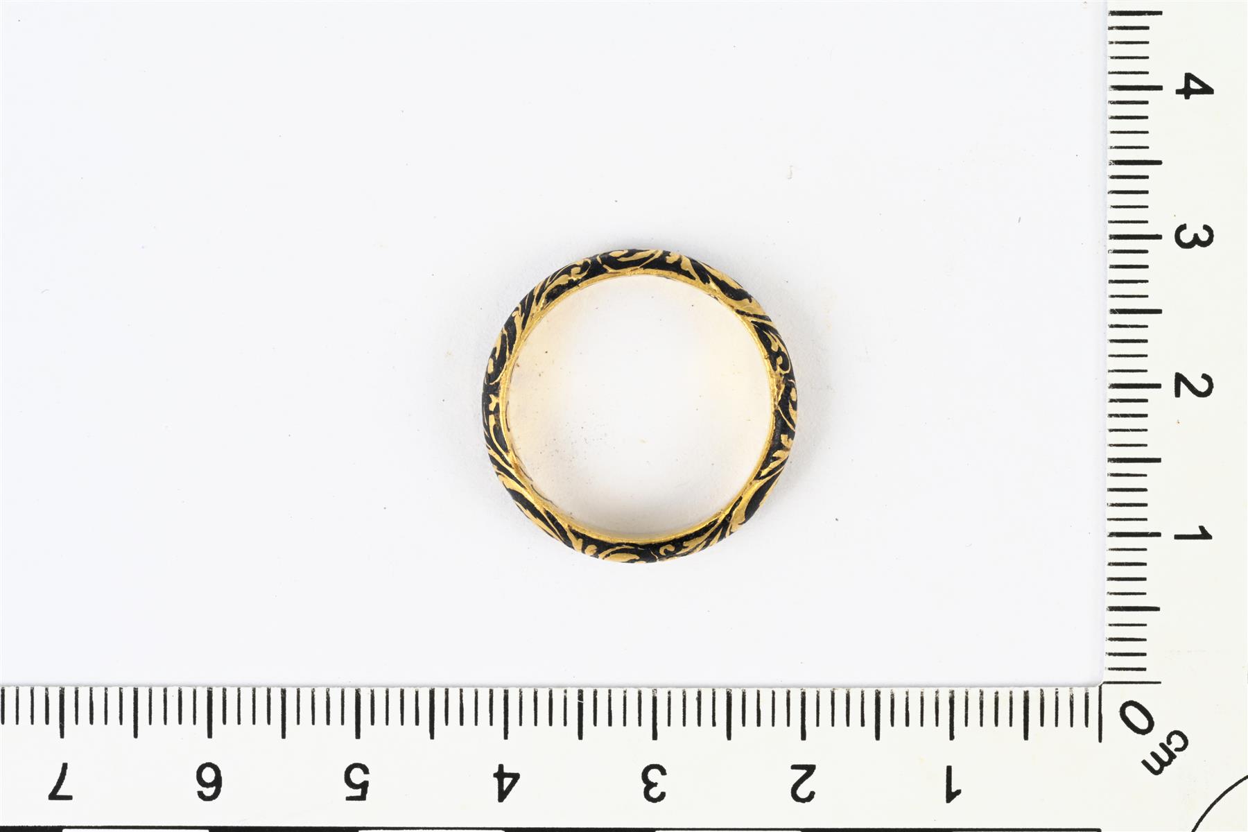 | Tasaleveä umpisormus. Ulkopinnassa on reliefikuvioista kasviornamentiikkaa ja mustaa emalointia. Sisäpuolella on kursiivilla kirjaimet A L S Q S C D F. Ei leimoja. | |