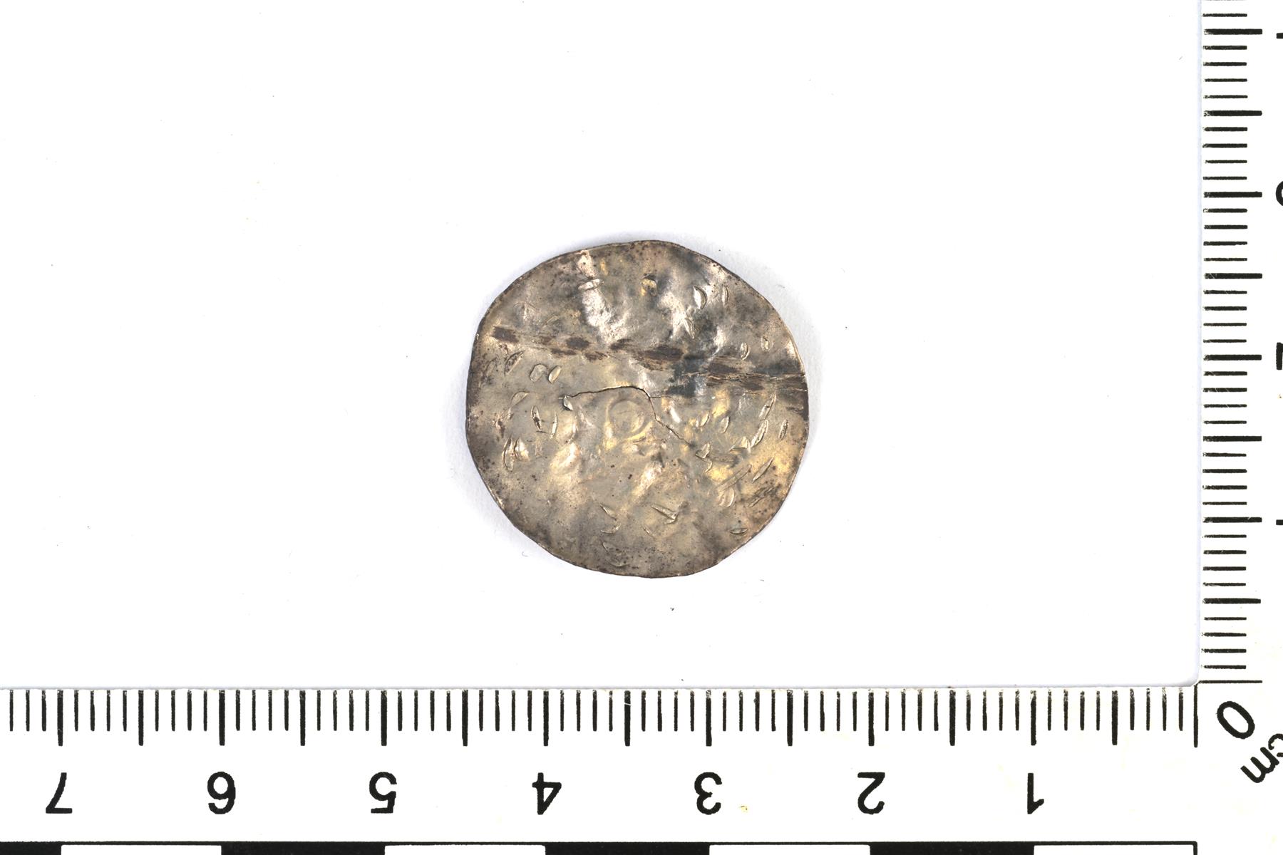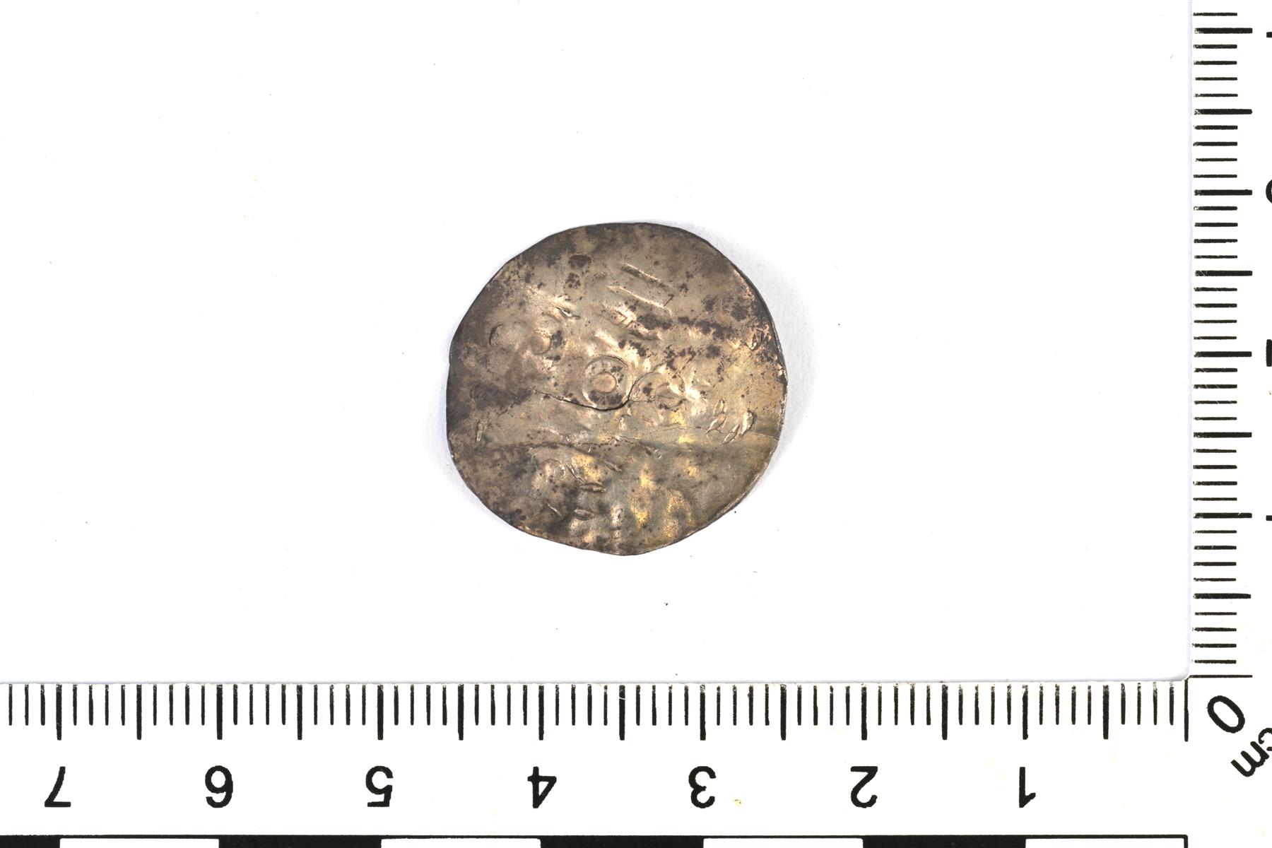 | Kölniläisen penningin yksipuolinen jäljitelmä. N. 1000-1050 jaa. Paljon testausjälkiä. | |