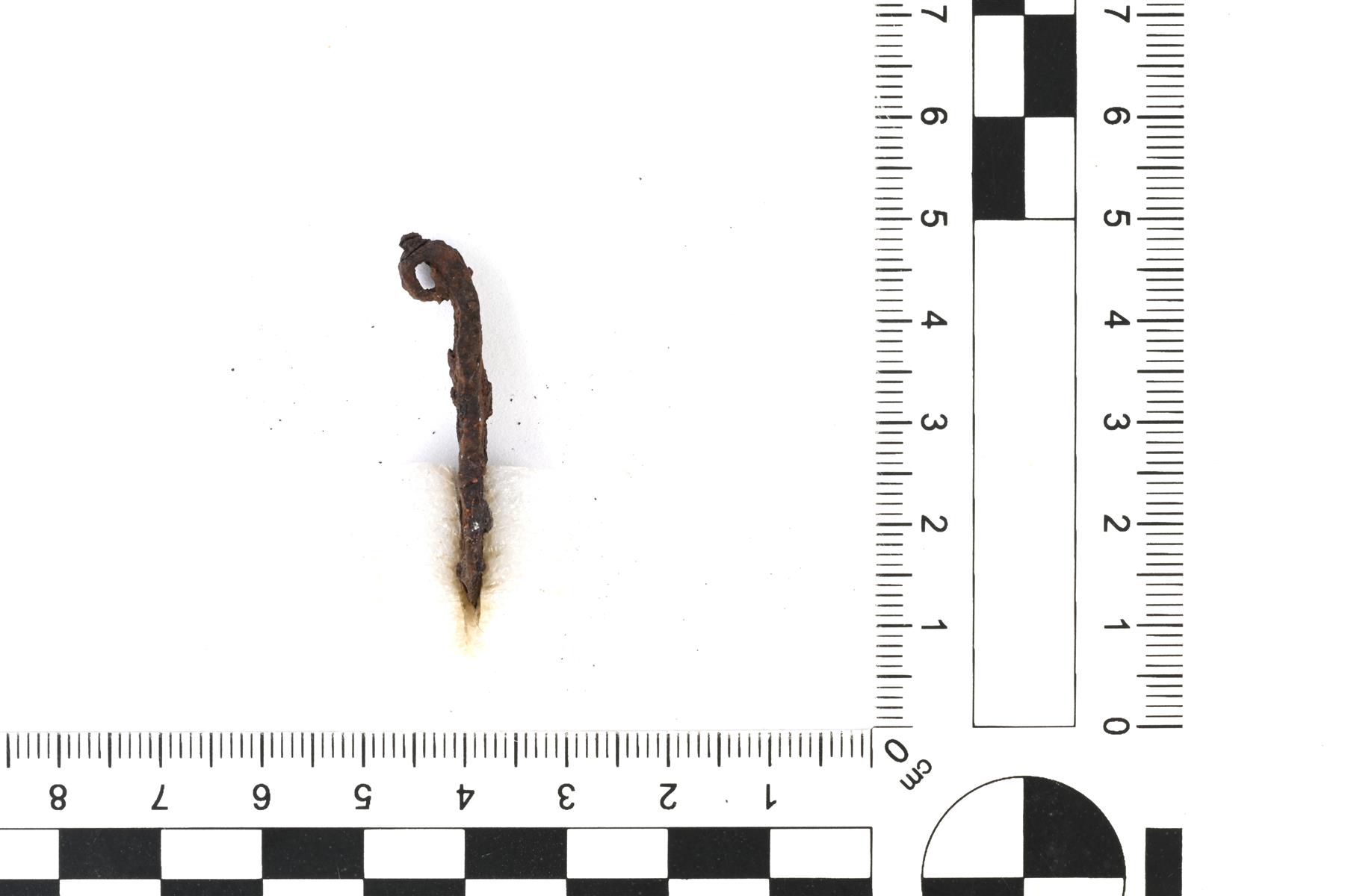 | Kapea ja pitkänomainen rautalevykolmio. Leveällä alasivulla terä, kapea kärki kierretty ripustuslenkiksi. Ns. kolmioriipus, jolle on tiedossa vastineita varsinkin pohjoisessa Fennoskandiassa. | |