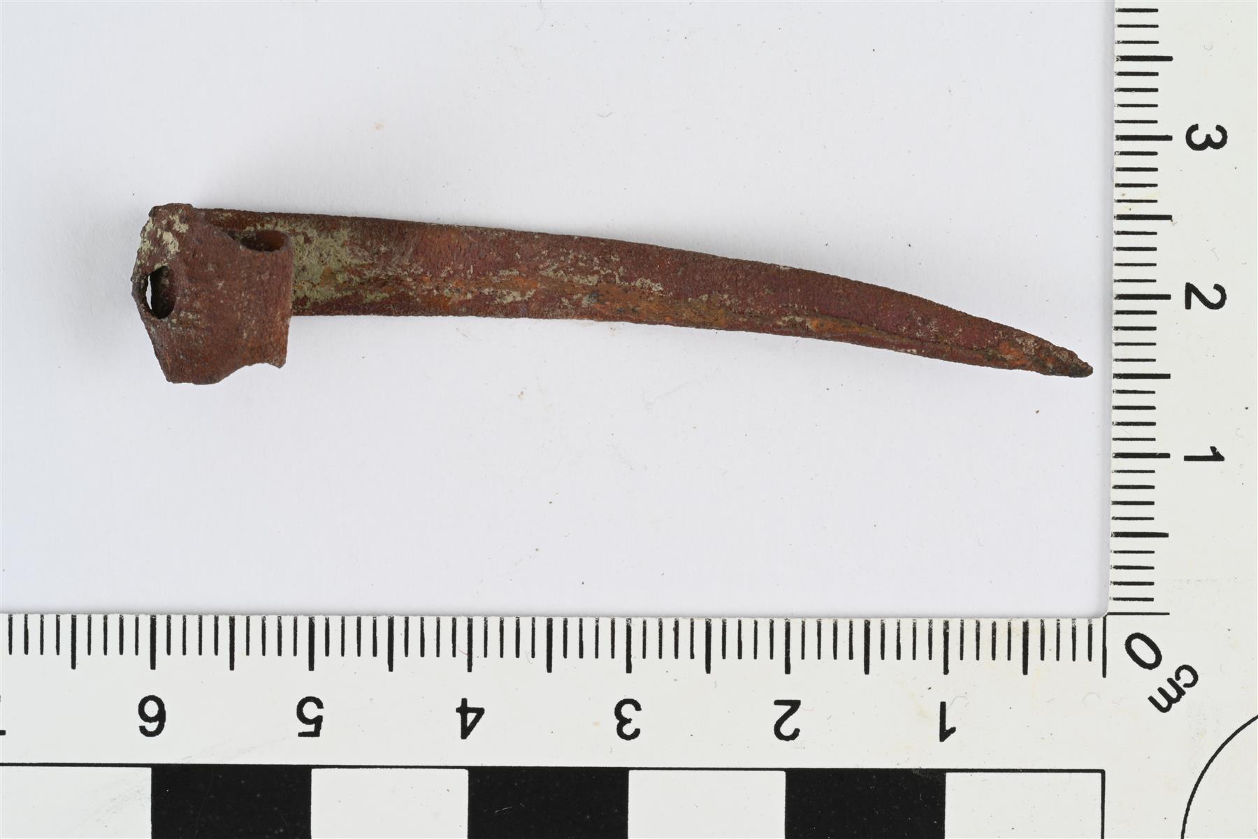 | Litteä koruneula, jonka päässä levennys ja siinä pyöreä reikä. Vääntynyt. | |