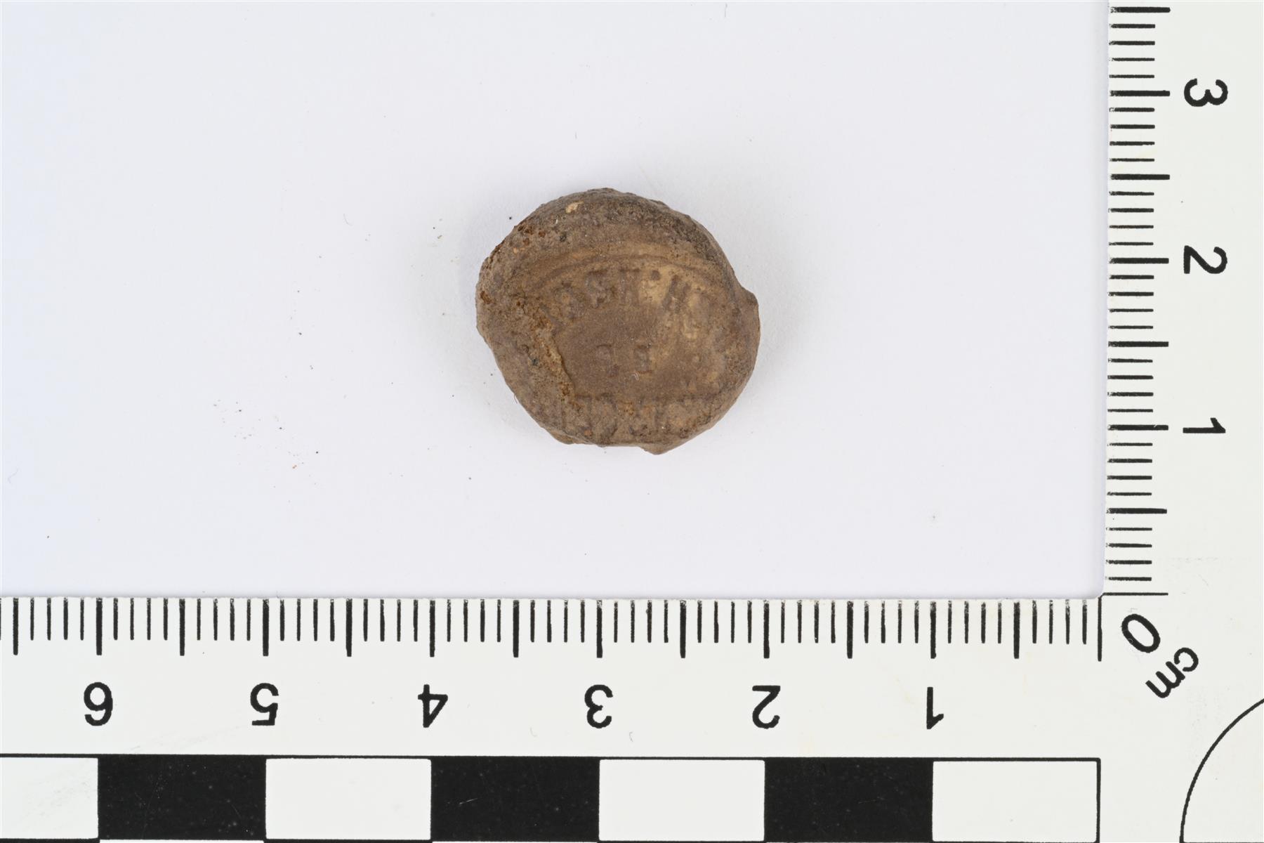 | Suurehkon pyöreän plombin tai sinetin katkelma. Kaksipuolinen, molemmilla puolilla leimat, joissa tekstiä, ja toisella puolella keskellä koristeellinen kruunu, vaakuna tms. | |