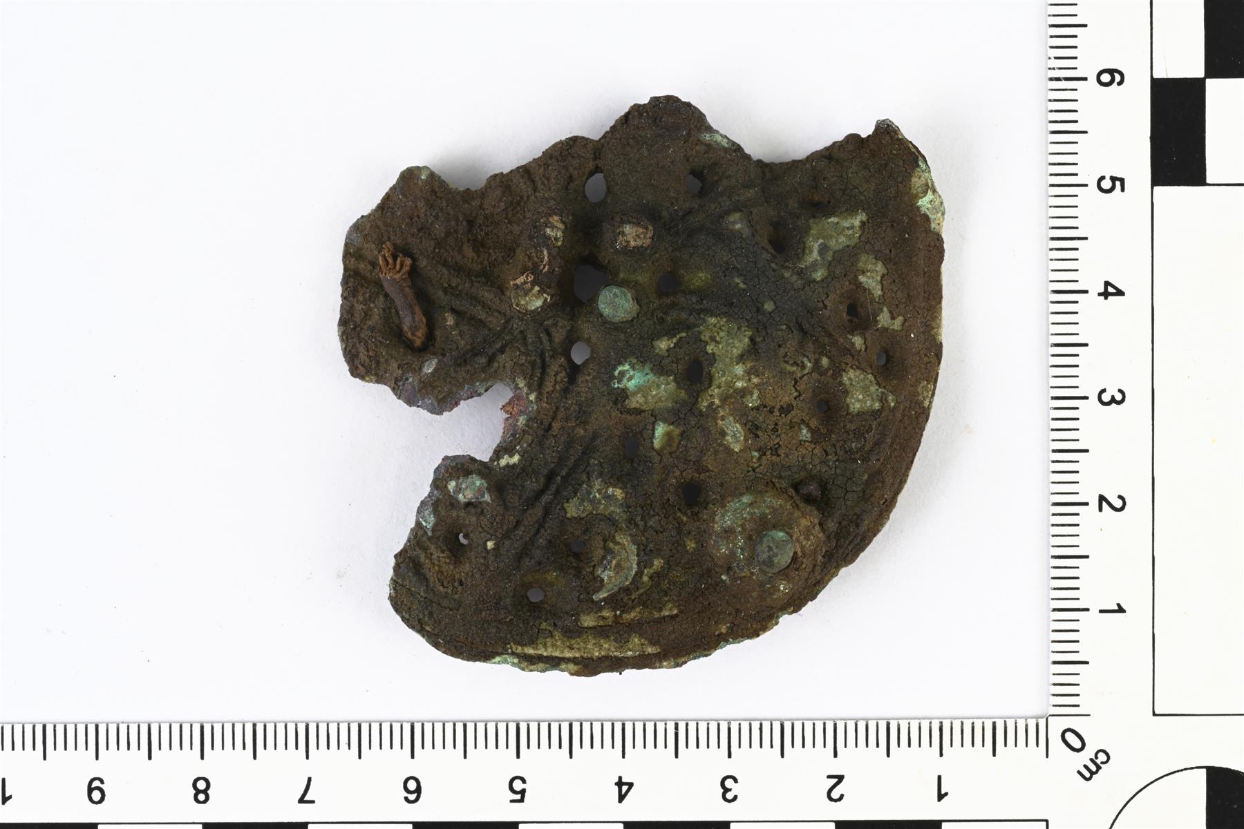 | Pyöreän kupurasoljen katkelma. Koristeluna tappeja, reikäkuvioita ja viivauurteilla tehtyjä nauhakäärmeitä. Taustapuolella on säilyneenä neulakota. Vastaa lähinnä C/D-tyypin solkien välimuotoa. | |