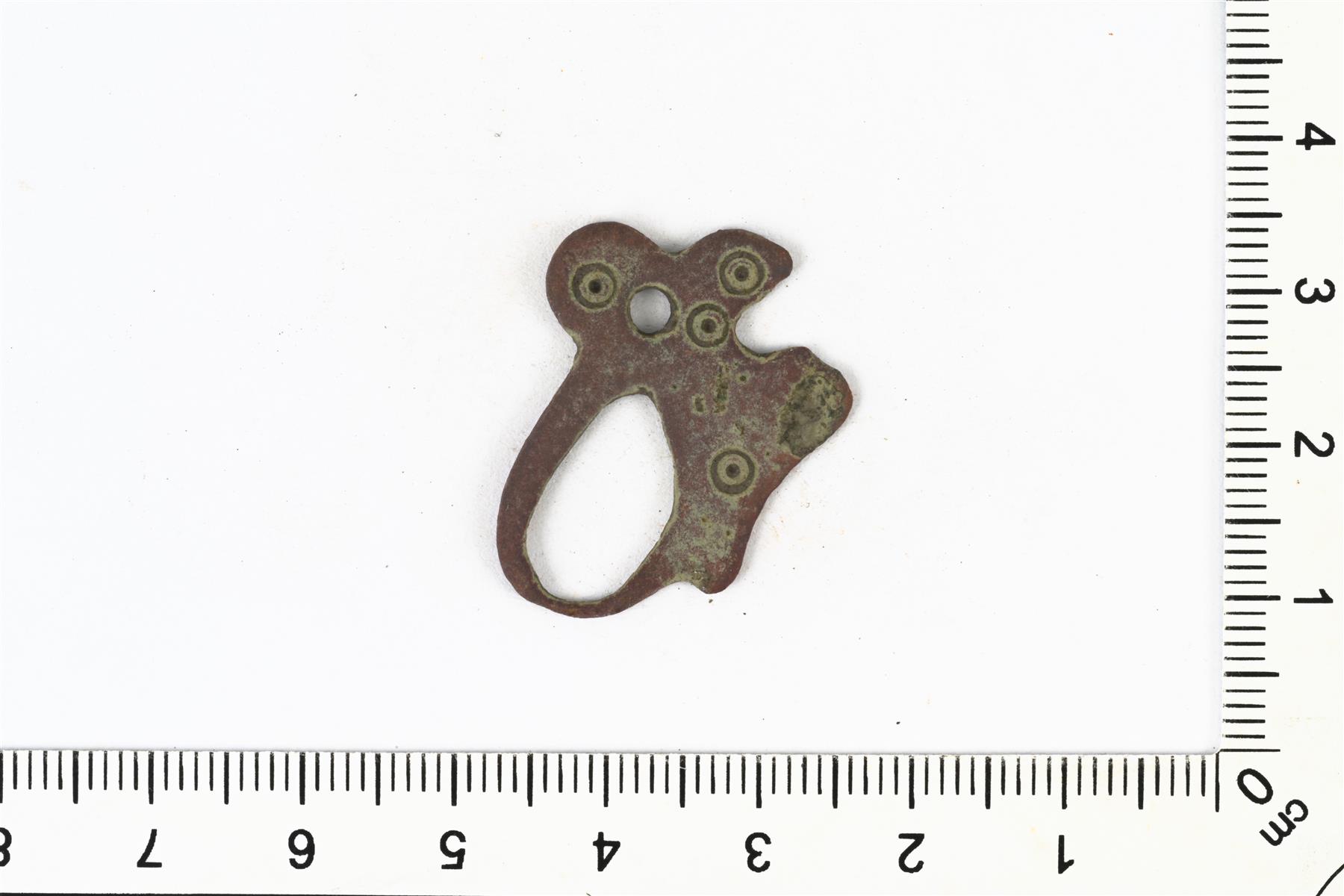 | Ketjunkantajan reunakatkelma. Koristeluna häränsilmäleimoja. Hyvin kulunut. | |