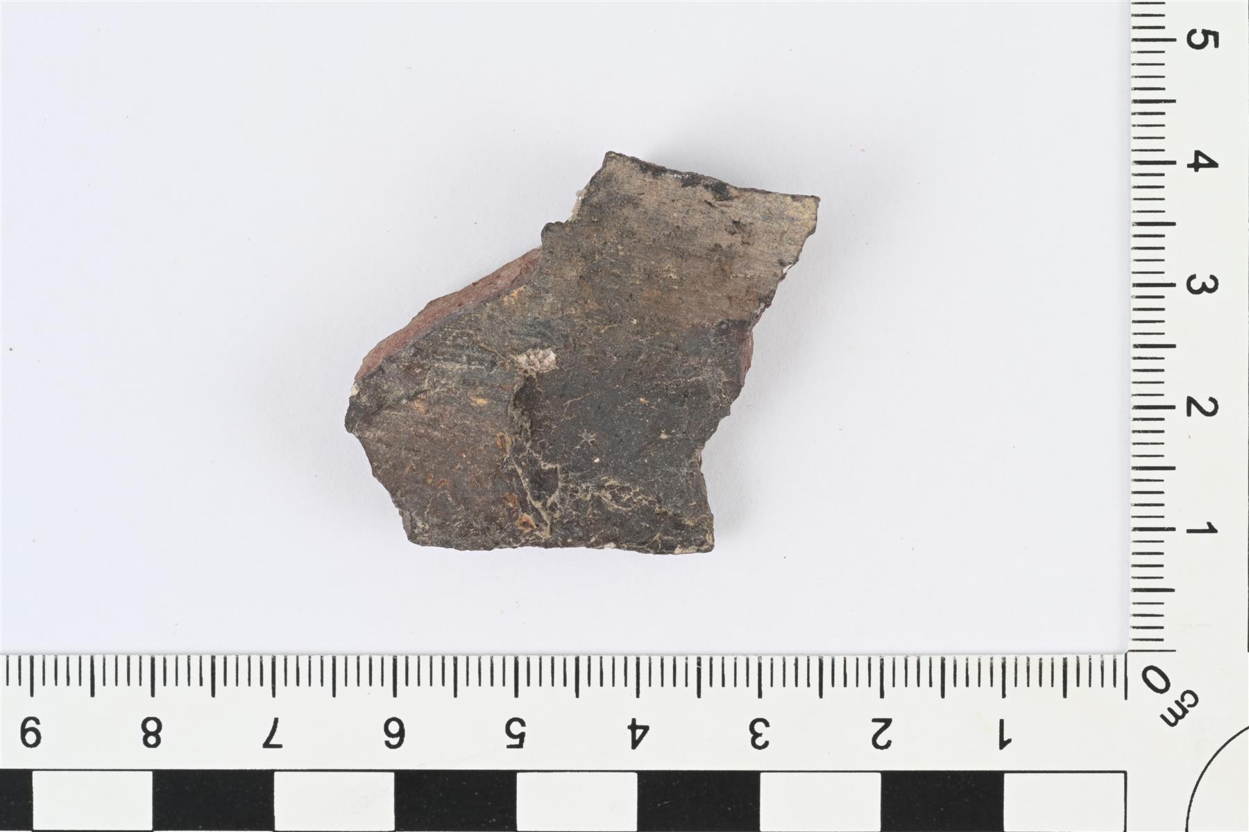 | Voimakkaasti palanut punasavikeramiikan pala. Voi olla peräisin astiasta tai muusta esineestä. | |