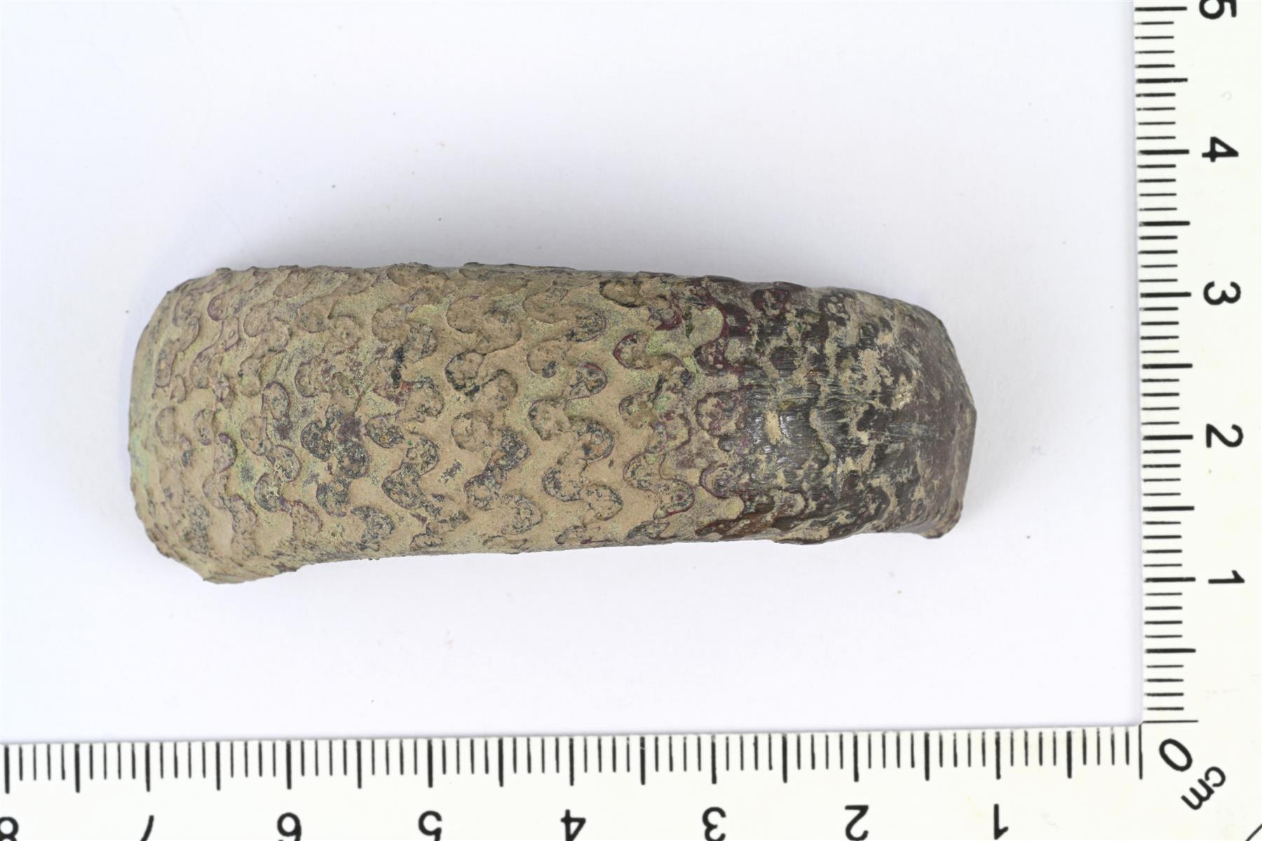 | Massiivisen rannerenkaan puolikas. Pinta on melko kulunut, mutta siinä erottuu aaltoleimakuvioinen koristekenttä. Vrt. Kivikoski Abb. 734. | |