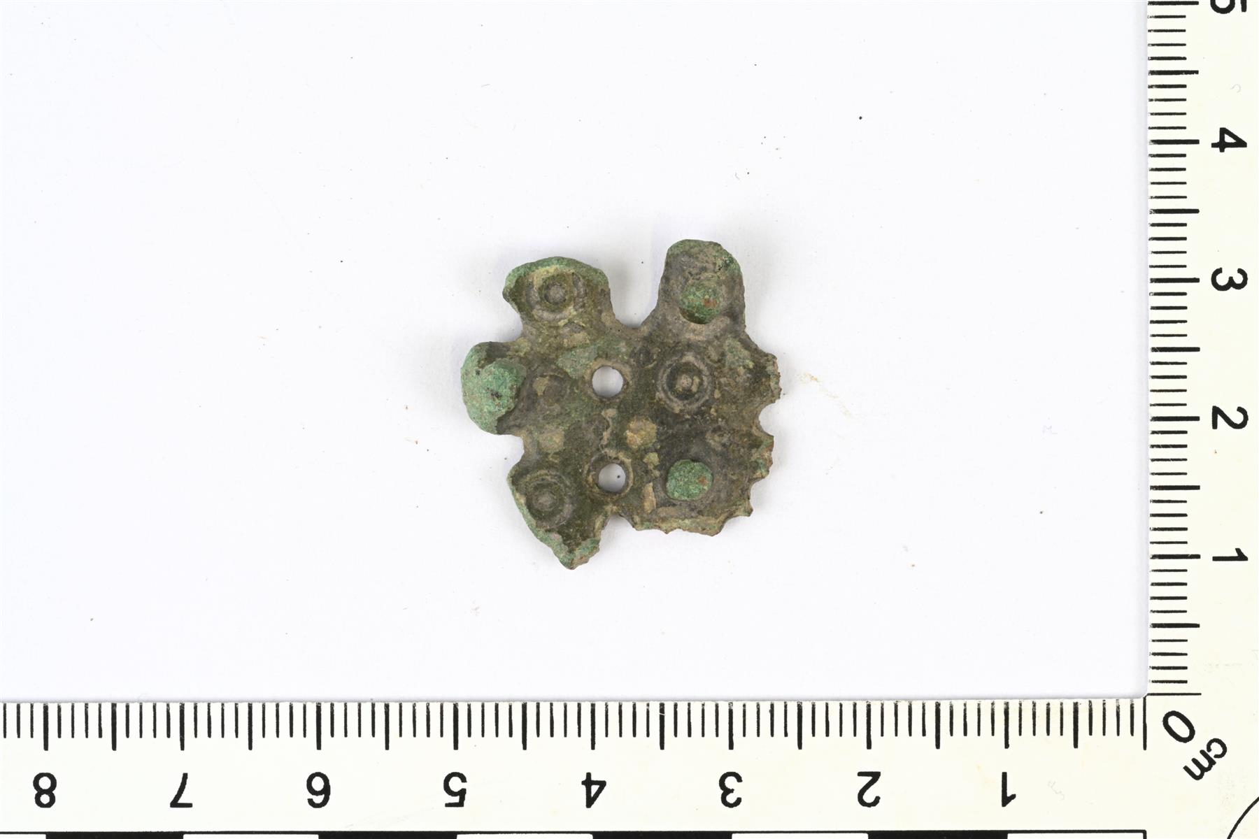 | Tappi-, reikä- ja häränsilmäleimoilla koristeltu riipuksen yläosan katkelma. Vrt. Kivikoski Abb. 783. | |