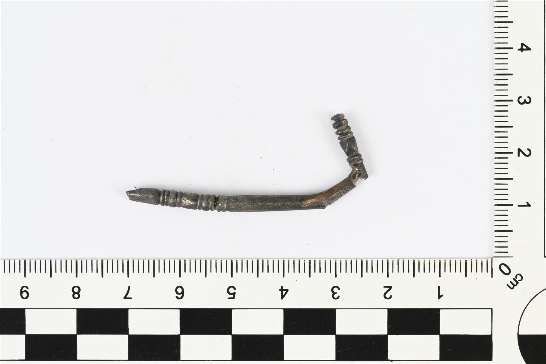 | Puikkomainen hopeaesineen katkelma. Koristeluna poikittaisia viivauurteita ja profilointia. Mahdollisesti toalettivälineen osa. | |