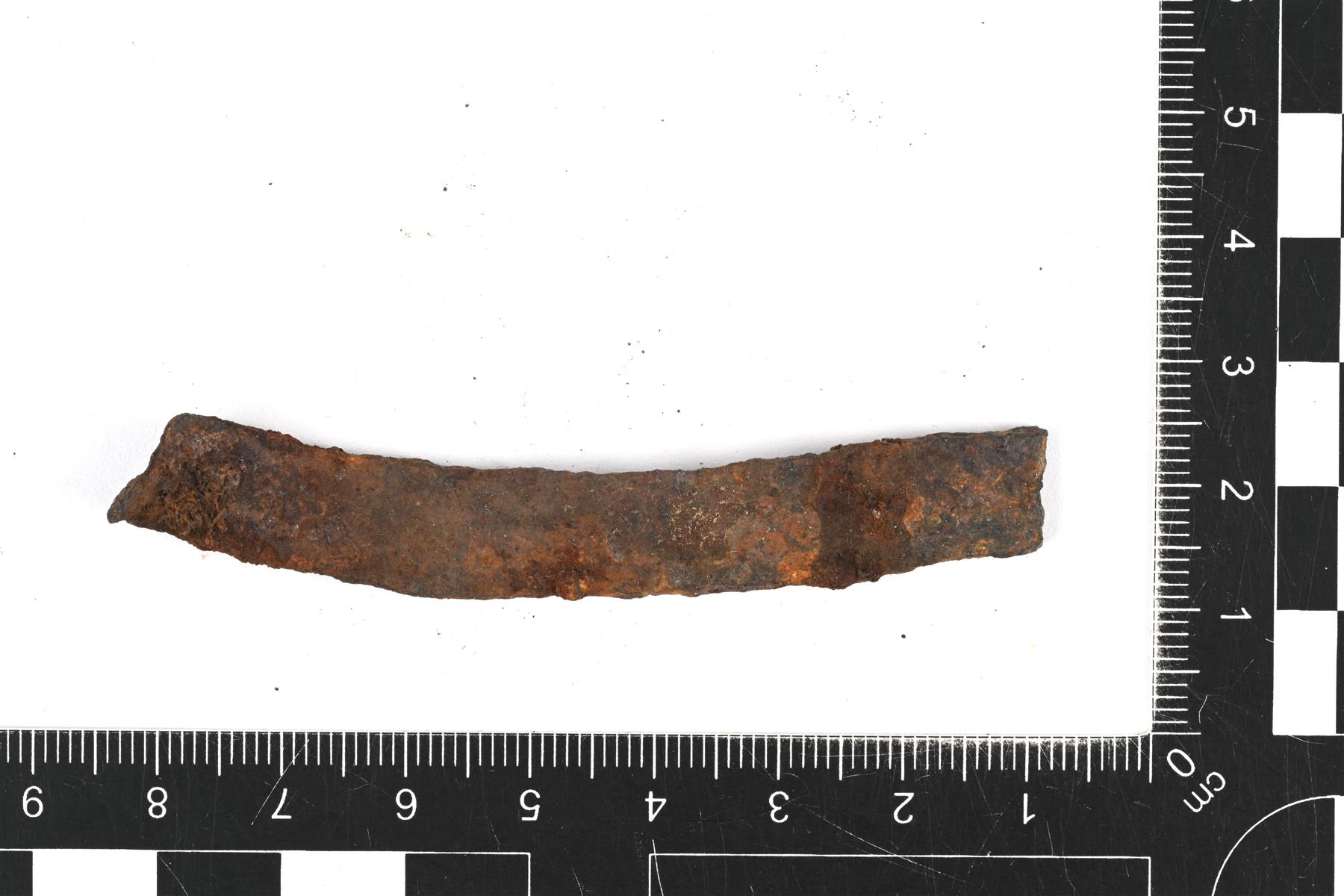 | Tasaleveä ja tasapaksu taotun rautalevyn katkelma, pitkä ja kapea, hieman kaareva lappeiden suunnalta nähtynä. Toisessa pääte taitos ja murtopinta. | |