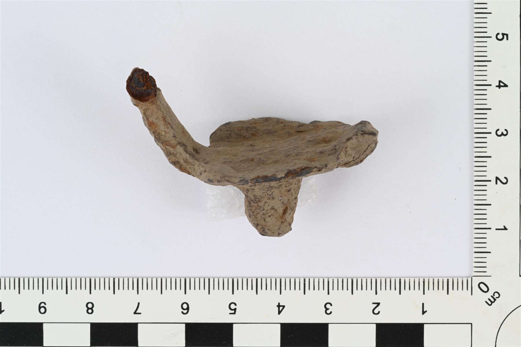 | Kaksipiikkinen hevosen viskari. Soikeahko levy, jonka keskellä toisella puolella kohoava ja suippeneva jäänasta. Levyn toisella puolella sen päissä ohuet taipuvat varret, joista toinen katkennut. Levyn reuna osittain murtunut. Vrt. Kivikoski 1973, Abb. 996. | |