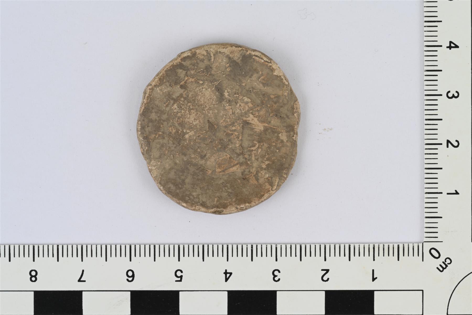 | Pyöreähkö lyijylevy, luultavasti sinetti. Toisella puolella puumerkkimäinen kuvio. Toisella puolella mahdollisesti heikosti erottuva kuvio tai muita jälkiä. | |