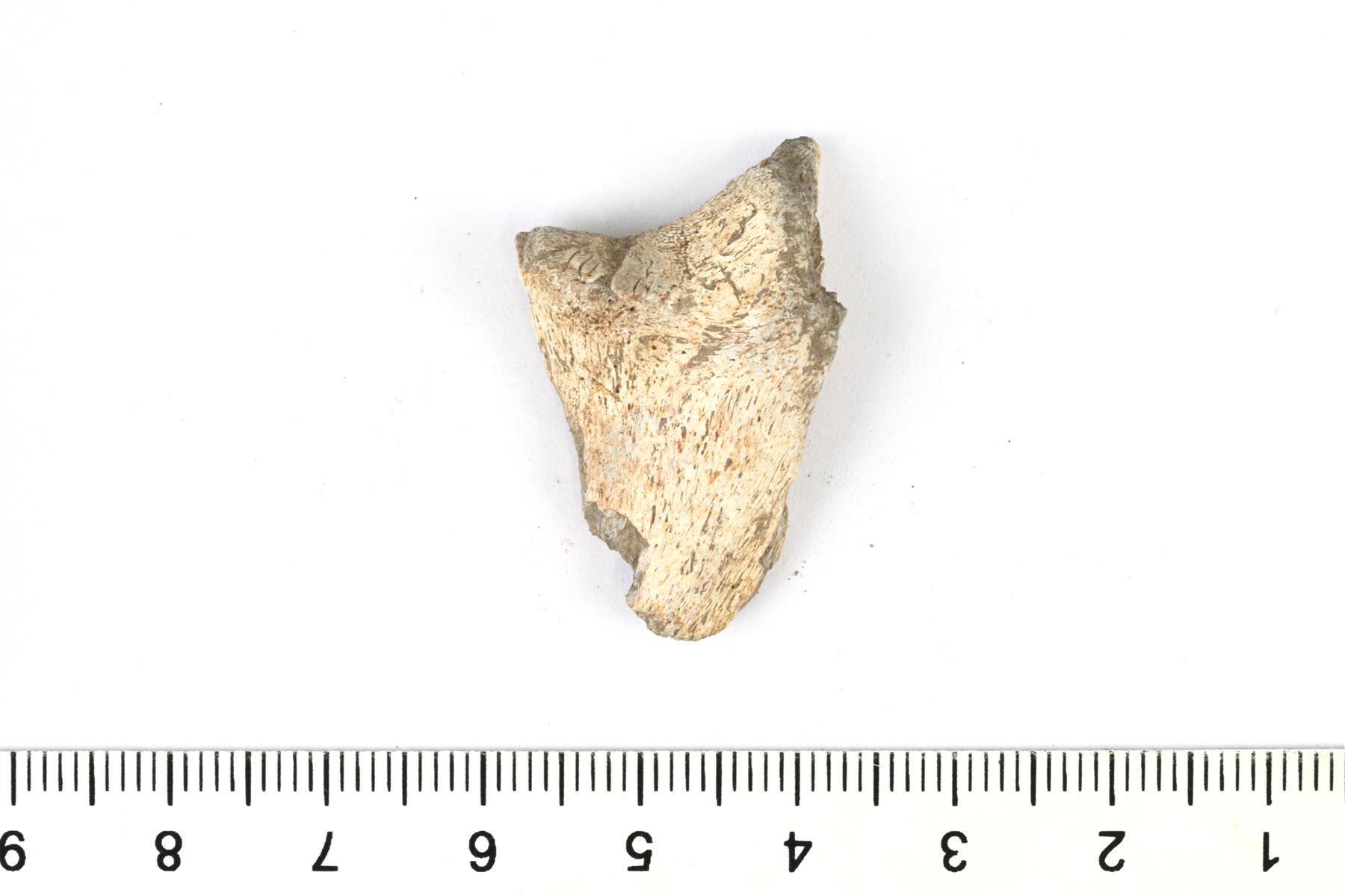 | Palaneen luun fragmentti. Palanut korkeassa lämpötilassa kokonaan valkoiseksi. | |