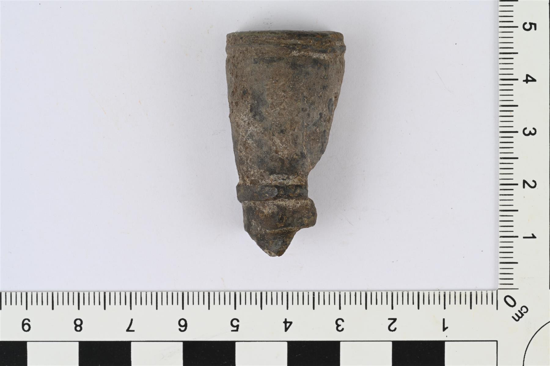 | Putkimaisen, poikkileikkaukseltaan pyöreän esineen katkelma. Toinen pää ehjä, esine kapenee murtuneeseen päähän. Ulkopinnalla profilointia. Mahdollisesti esim. kynttilänjalan osa. | |