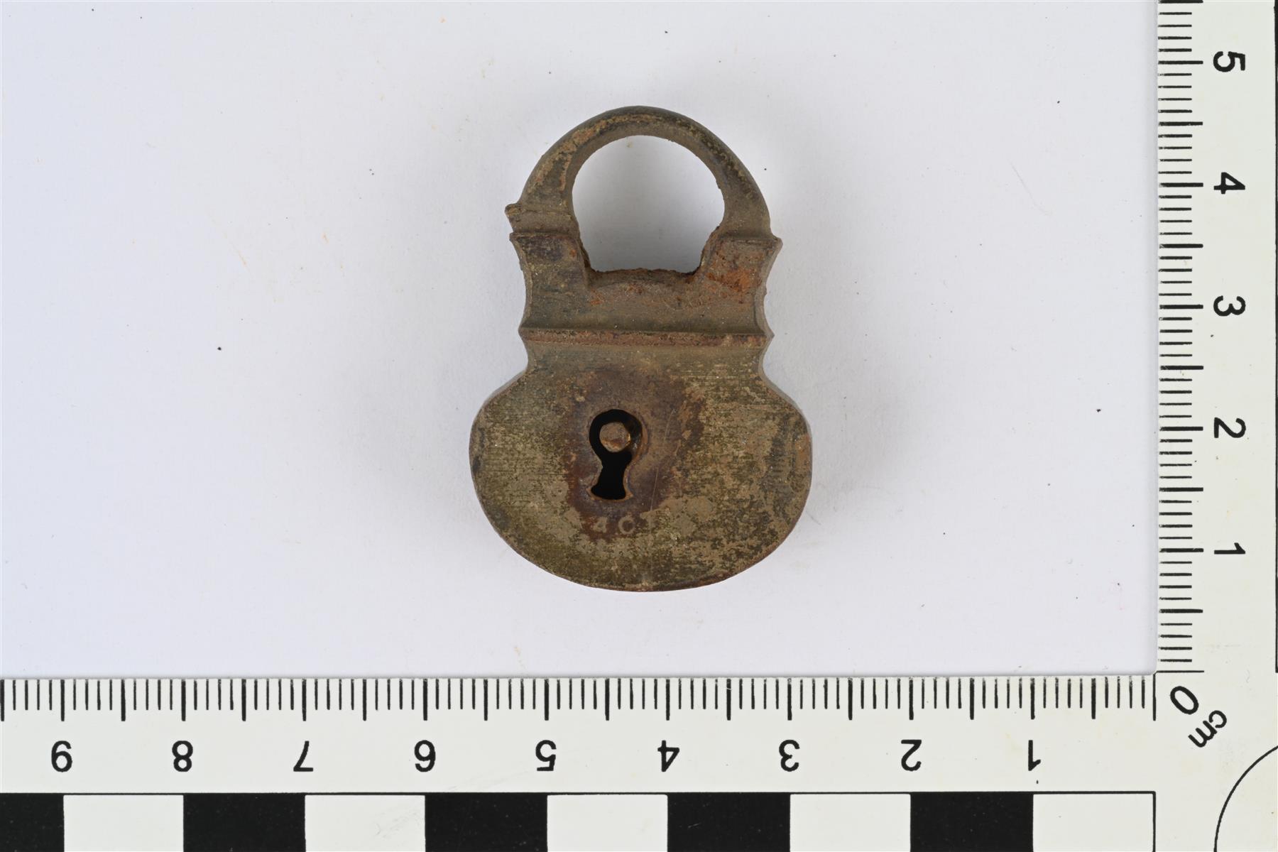 | Pieni litteä riippulukko. Etupuolella avaimenreikä sekä tiheää poikkiviivoitusta ja tekstiä kyrillisin kirjaimin. | |