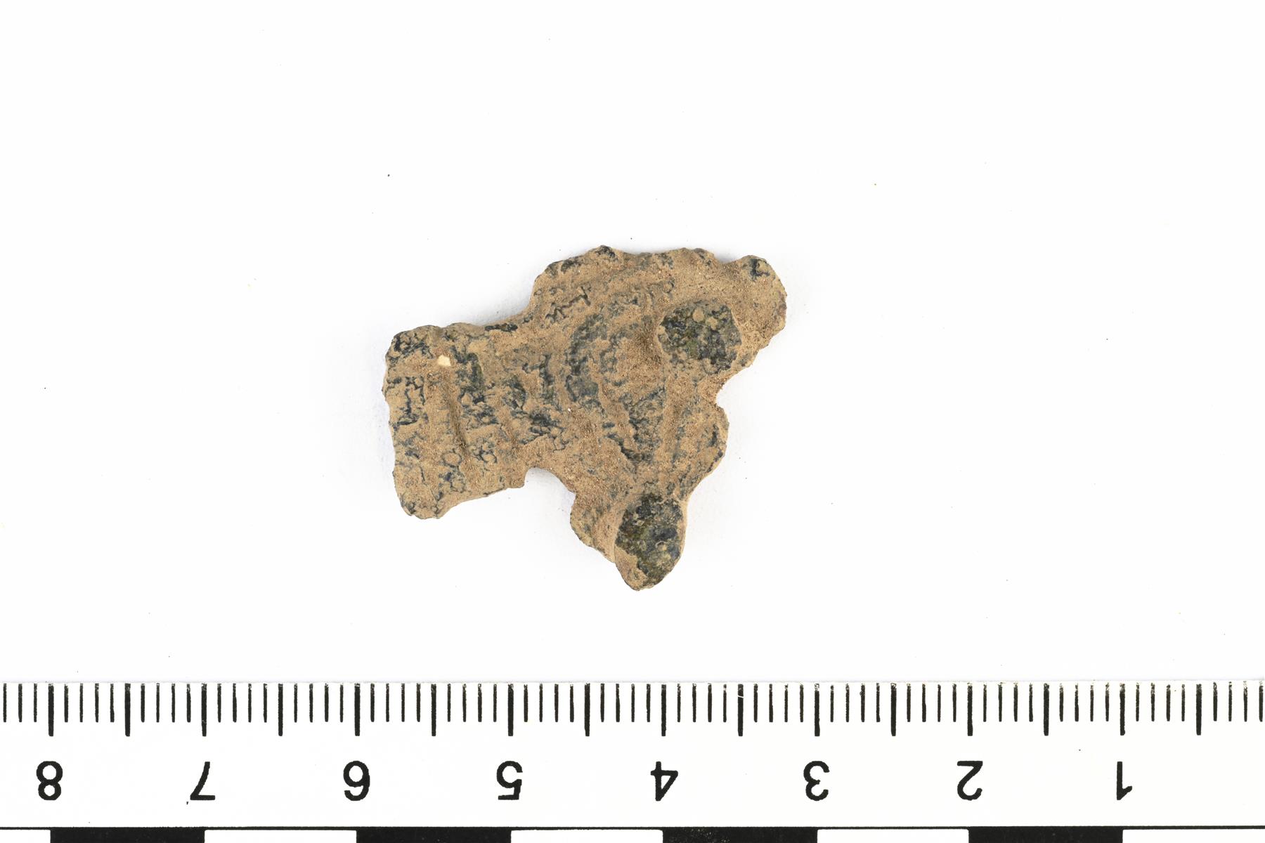 F-tyypin pyöreän kupurasoljen reunakatkelma. Pinta on melko kulunut, mutta siitä erottuu tappeja ja viivauurrekuviointia. | |