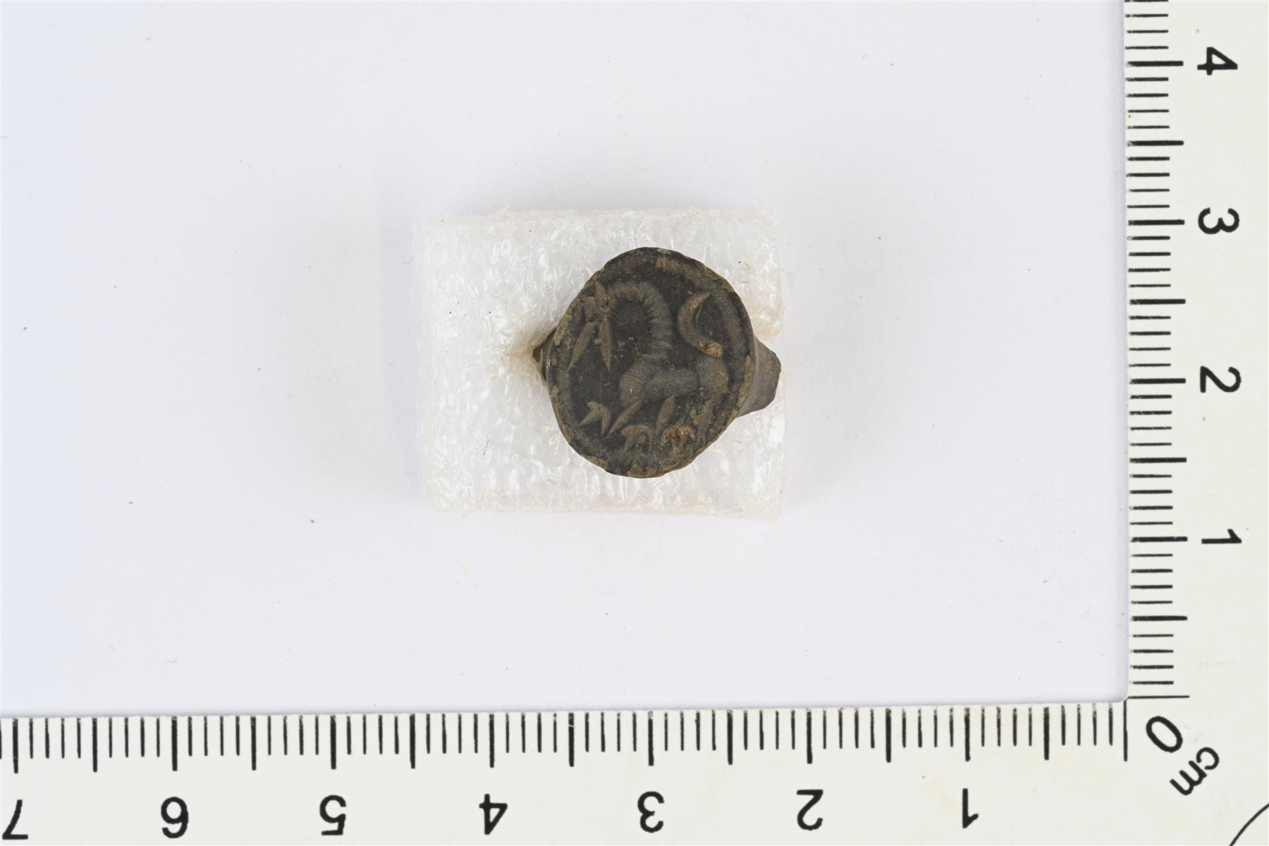 | Kuvasormuksen, ns. Sarvas-sormuksen katkelma. Pyöreähkö kanta, johon uurrettu nelijalkainen pitkäkaulainen eläin, luultavasti lohikäärme. Kannan koko 13 x 14 mm. | |