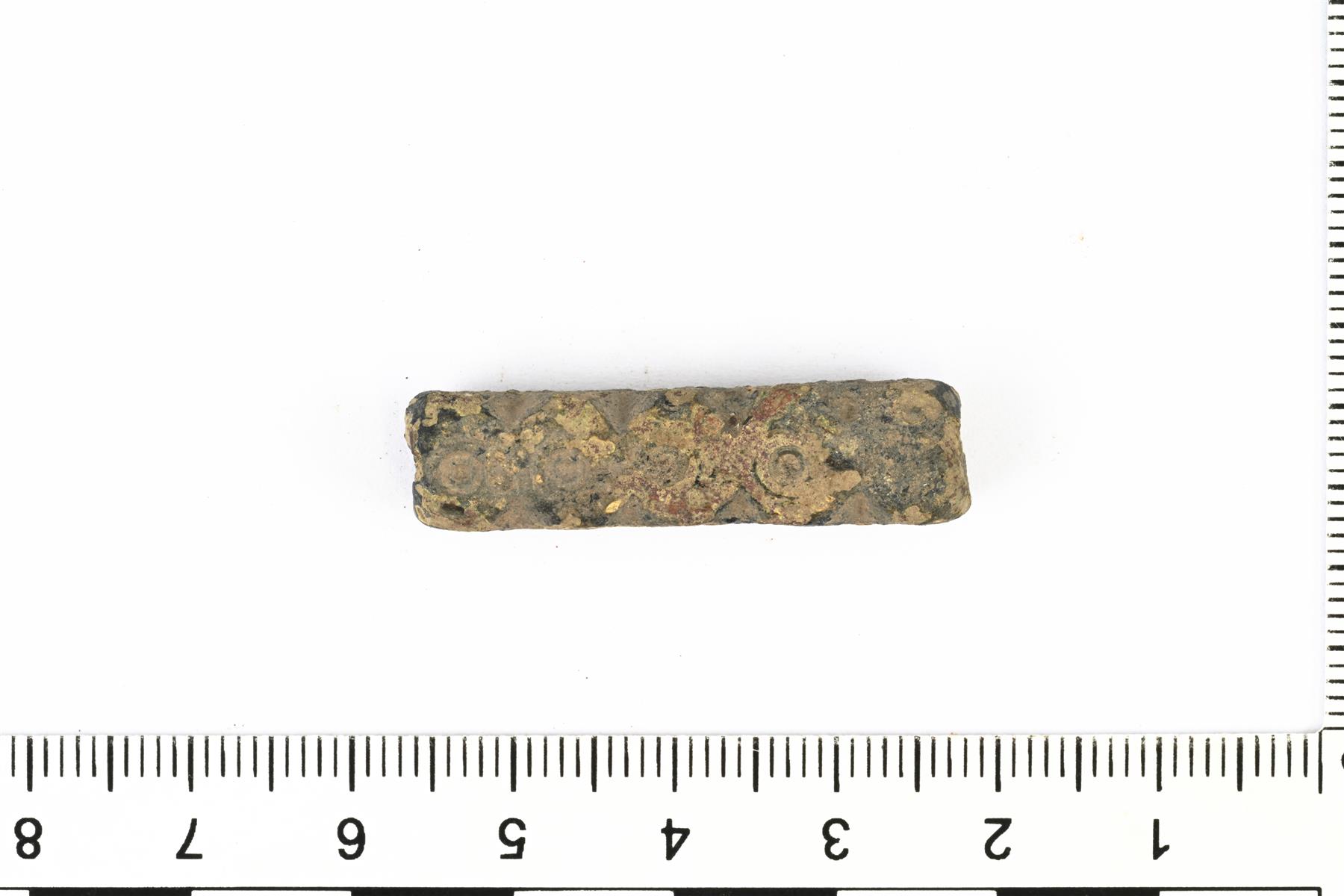 | Viisilohkoinen sarjahelmi. Helmet on fasetoitu. Koristeluna häränsilmäleimoja. | |