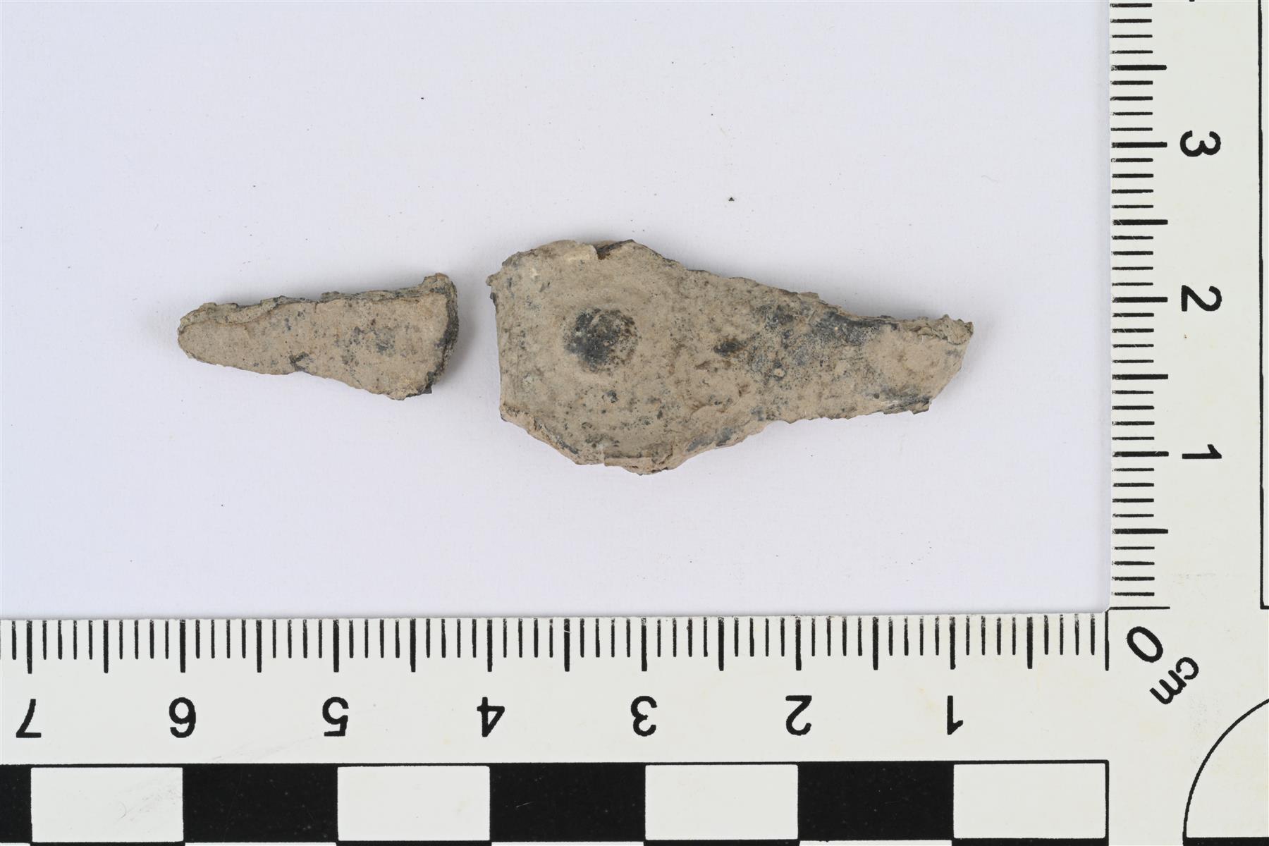 | Katkelmia luultavasti talonpoikaissormuksesta. Keskelle ja etupuolelle levenevä sormus, luultavasti ollut avoin takaa. Keskellä kohopallo. | |