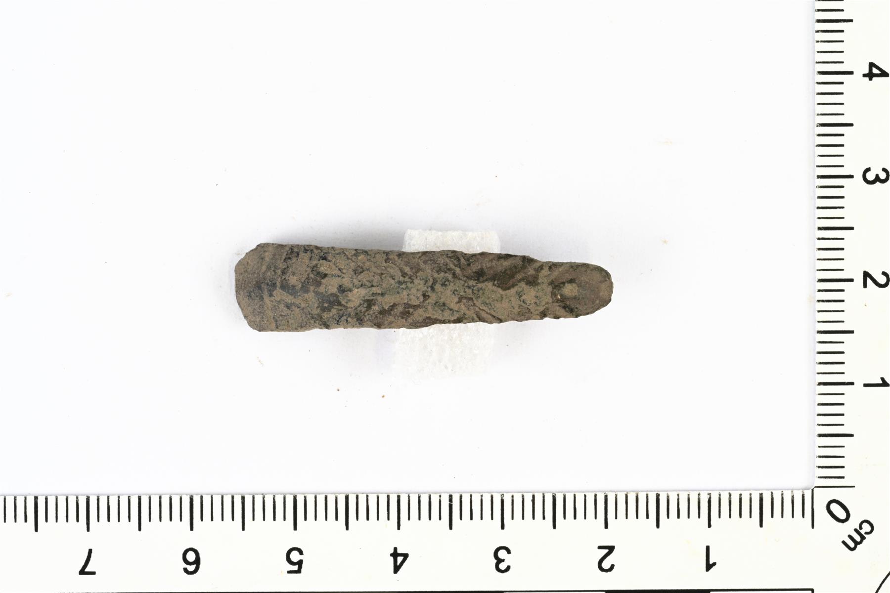 | Päähän kapenevan rannerenkaan katkelma. Koristelusta erottuu viivauurteita. Poikkileikkaus on kolmiomainen. Vrt. Kivikoski Abb. 738. | |