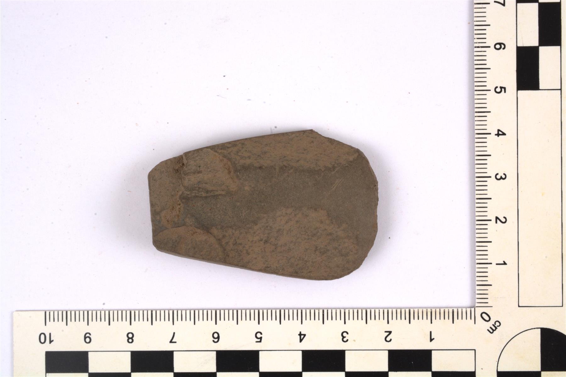 | Tasataltan katkelma. Kanta puuttuu. Yläpinnassa on säilyneenä hiottua pintaa. | |