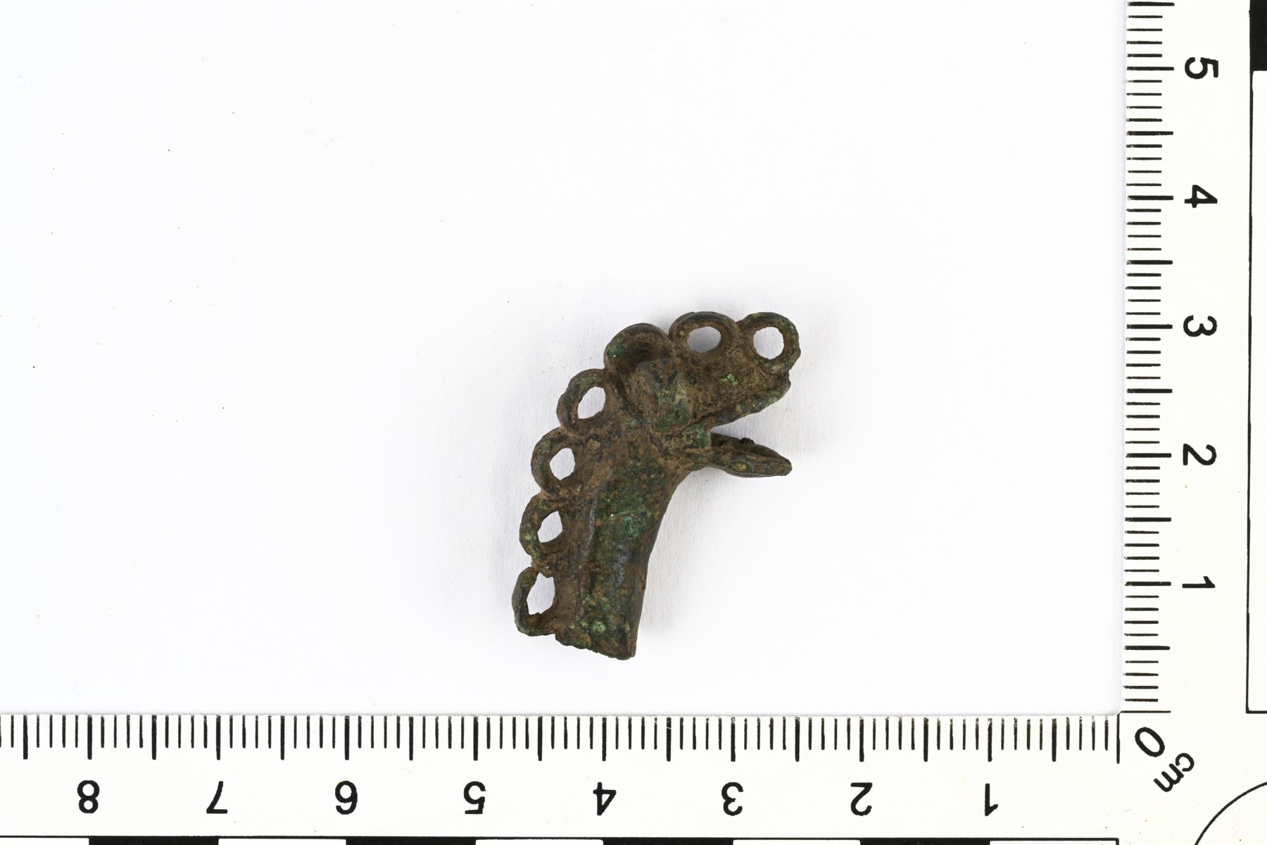 | Hevosriipuksen pääkatkelma. Harjana ja silminä on pieniä lenkkejä. Sisältä ontto. Vrt. Kivikoski Abb. 1136. | |