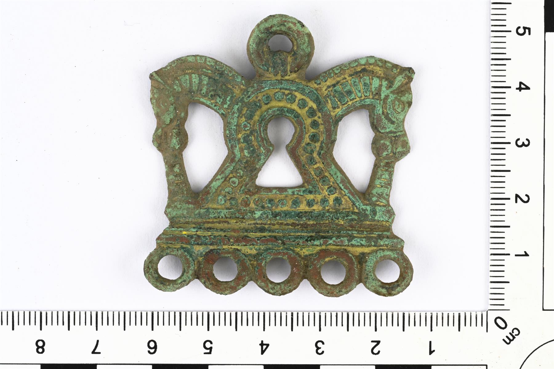 | Hieman vääntynyt kaksoishevosriipus. Alareunassa on viisi ripustuslenkkiä. | |