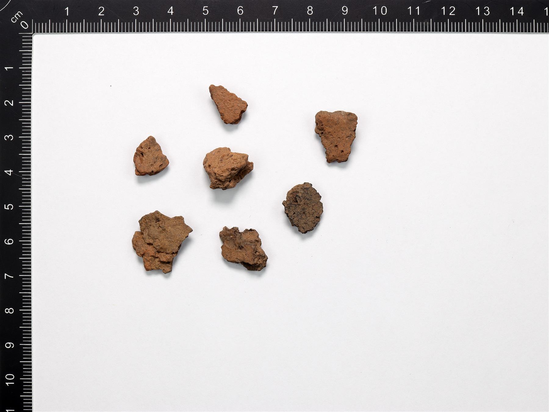 | Pieniä lohjenneita saviastian paloja. Savimassa on orgaanissekoitteinen ja väriltään harmaanruskea. | |