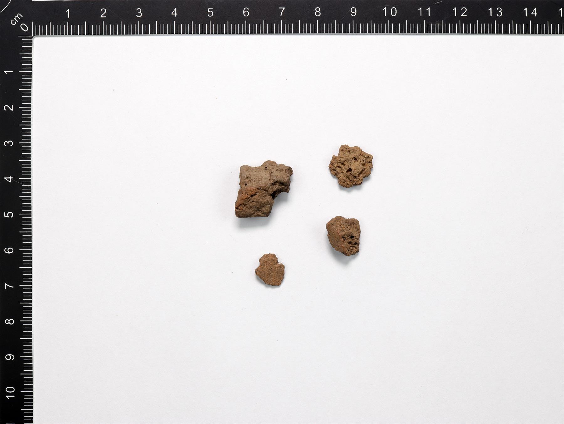 | Koristelemattomia saviastian paloja, joista kolme ovat lohjenneita. Savimassa on orgaanissekoitteinen ja väriltään harmaanruskea. | |