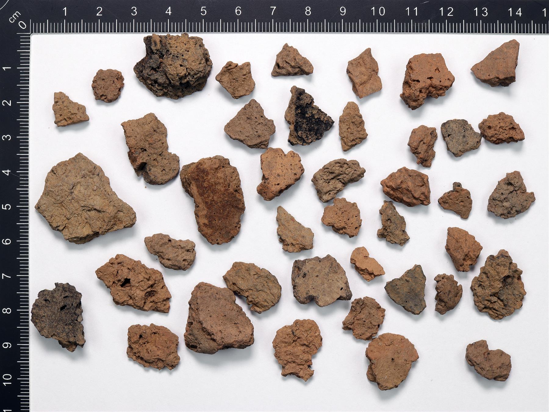 | Saviastian paloja, joista kaikki paitsi yksi ovat lohjenneita. Savimassa on orgaanissekoitteinen ja väriltään harmaanruskea. Muutamassa palassa erottuu myös vähäinen määrä hiekkasekoitetta. Muutamassa palassa on myös hiiltynyttä pintakarstaa. | |
