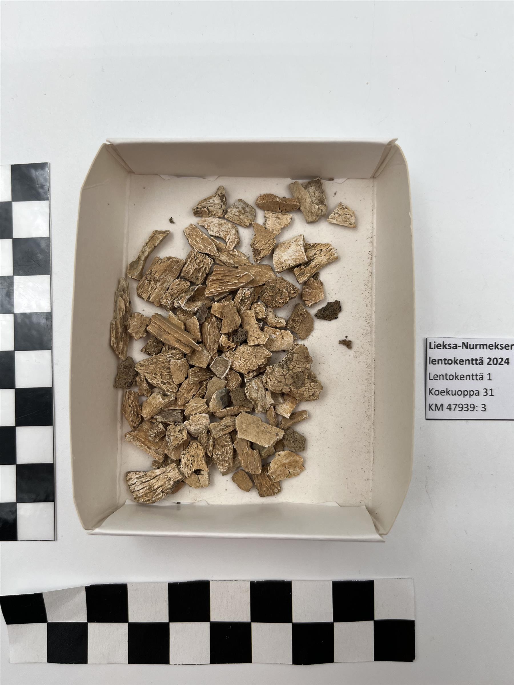 | Koekuopan 31 pinnalta poimittuja palaneiden luiden fragmentteja. | |